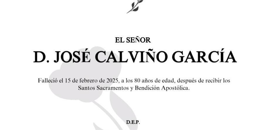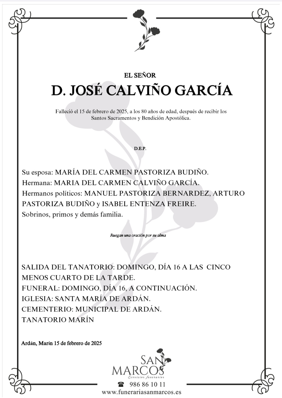 La funeraria SAN MARCOS comunica el fallecimiento HOY día 15 de febrero, de Don JOSÉ CALVIÑO GARCÍA cuyos restos mortales permanecerán en el Tanatorio San Marcos, de Marín, hasta el momento de su traslado, MAÑANA DOMINGO día 16, a las cinco de la tarde para su inhumación en el Cementerio Municipal de ARDÁN.