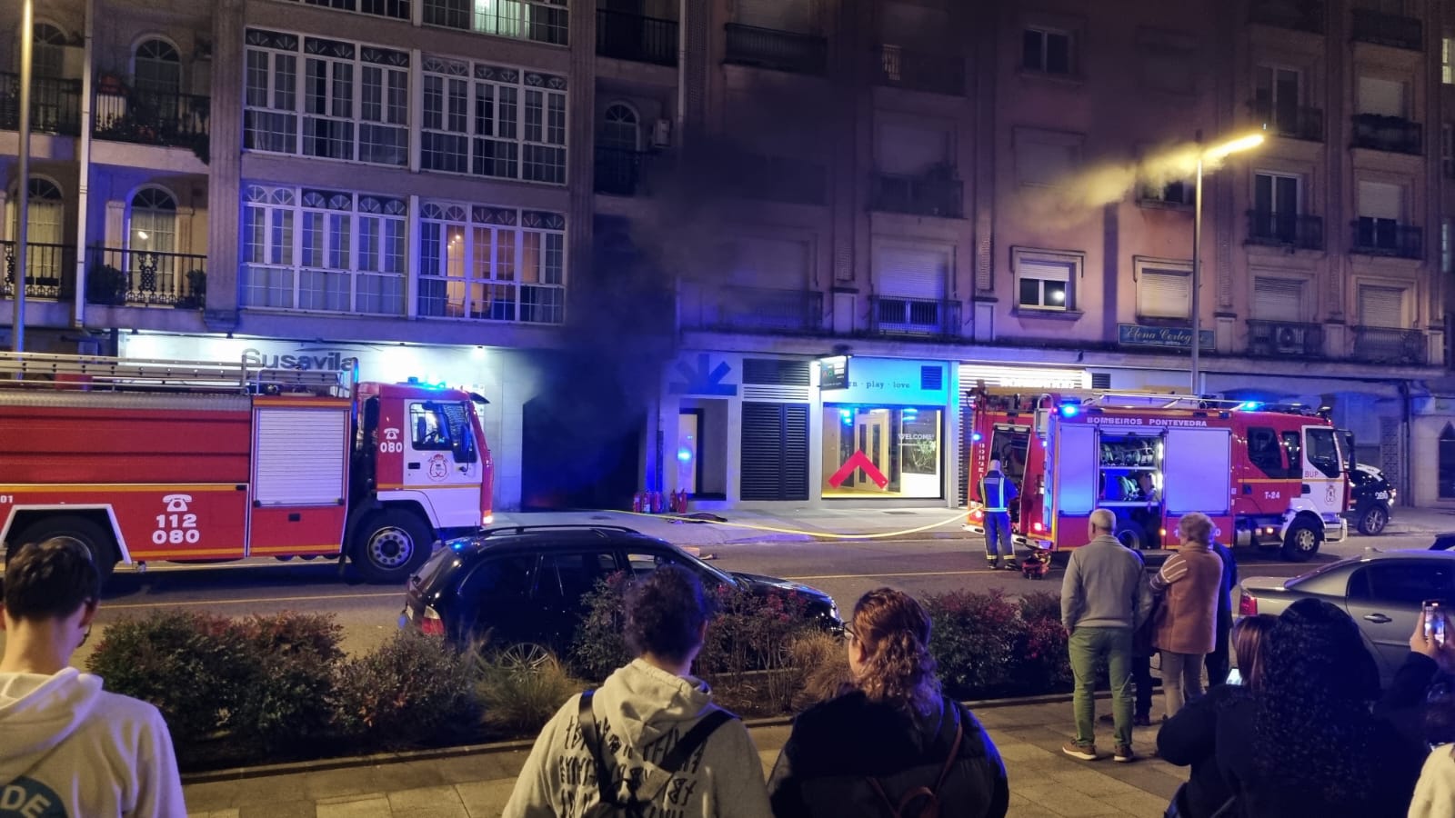 Llegaron los miembros de las policías Local y Nacional y poco después los bomberos, primero los de Pontevedra que empezaron la labor de la extinción del fuego no sin dificultad por el estrecho pasillo de la rampa de bajada y el denso humo. Minutos después los de Morrazo que colaboraron en las tareas. Mientras tanto los vecinos del entorno se encontraban en la calle esperando que la cosa no fuera a más y en evitación de respirar en sus viviendas los gases propios del incidente.