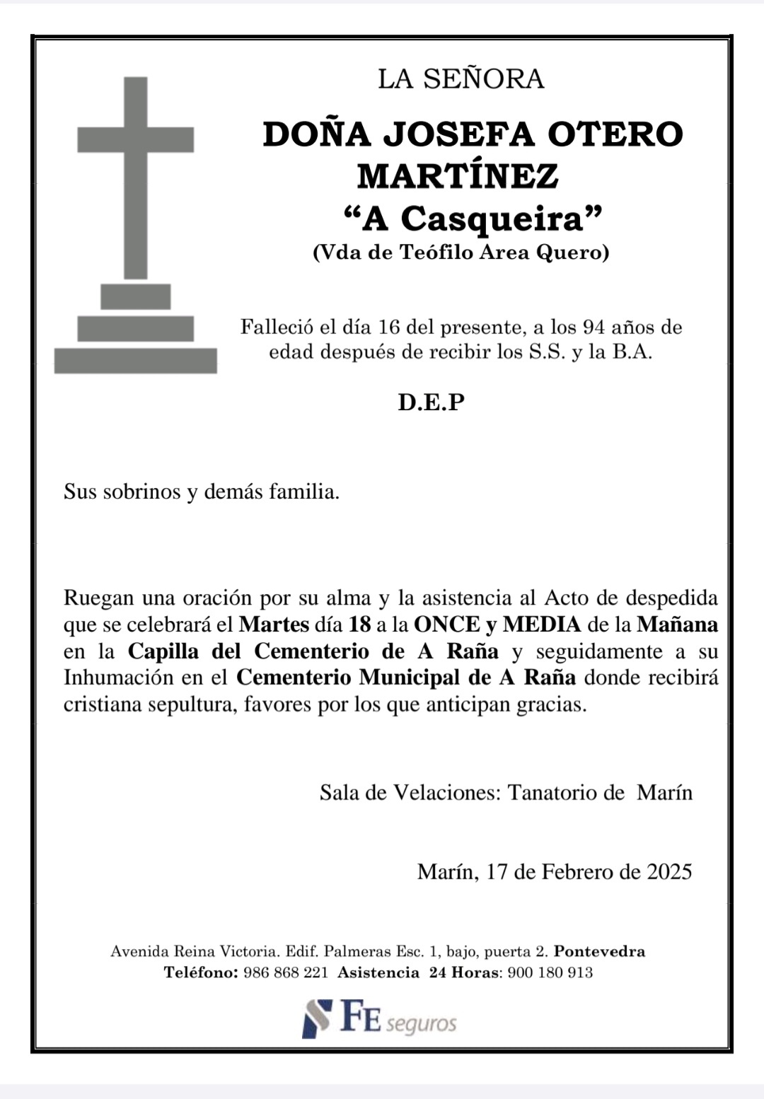 La funeraria LA FE comunica el fallecimiento ayer día 16 de febrero, de Doña JOSEFA OTERO MARTÍNEZ cuyos restos mortales permanecerán en el Tanatorio Marín hasta el momento de su traslado, MAÑANA MARTES día 18, a las once y media de la mañana para su inhumación en el Cementerio Municipal de A Raña. D.E.P.