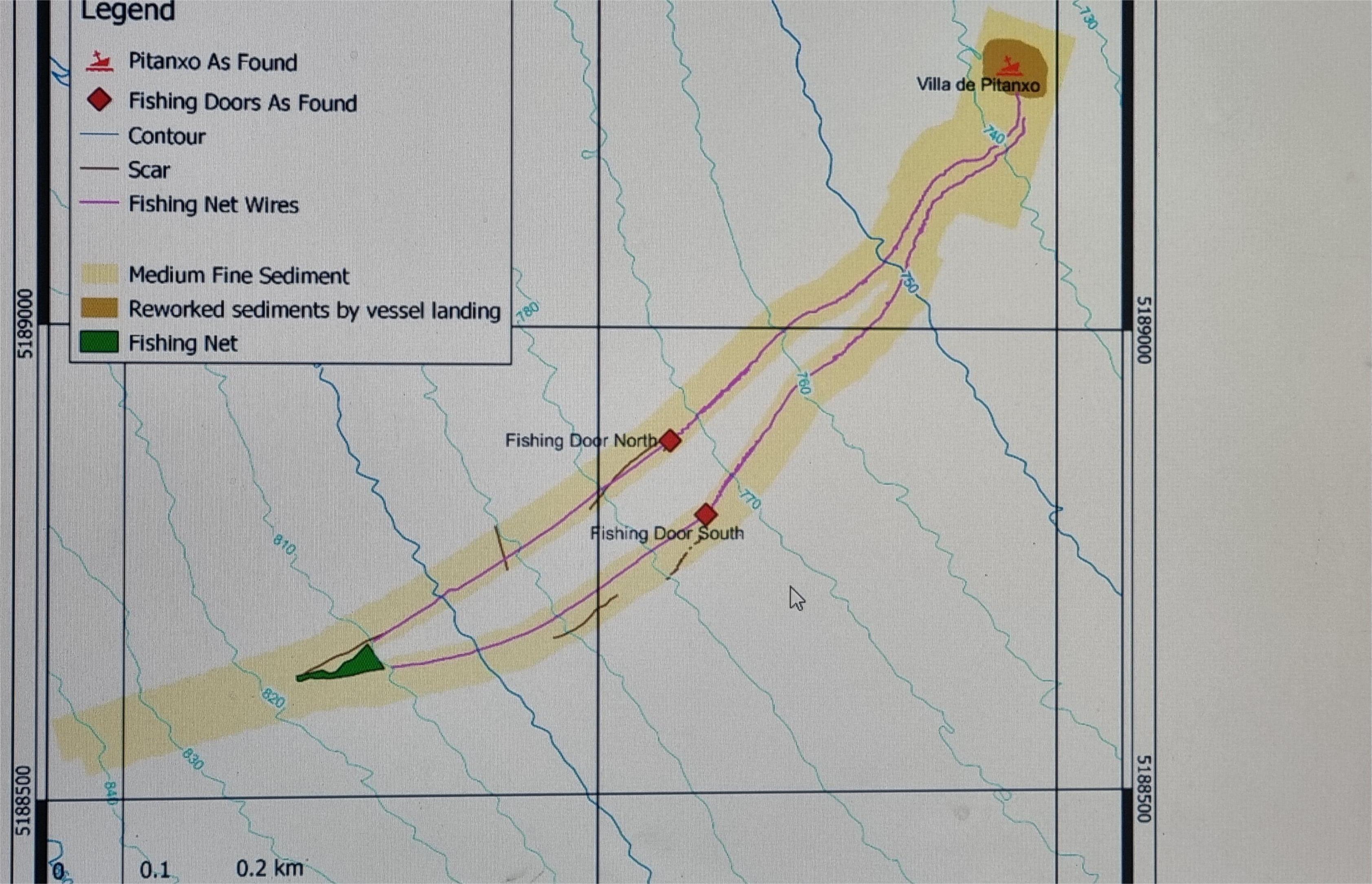 Imagen de la posición del barco y el aparejo en el fondo del mar