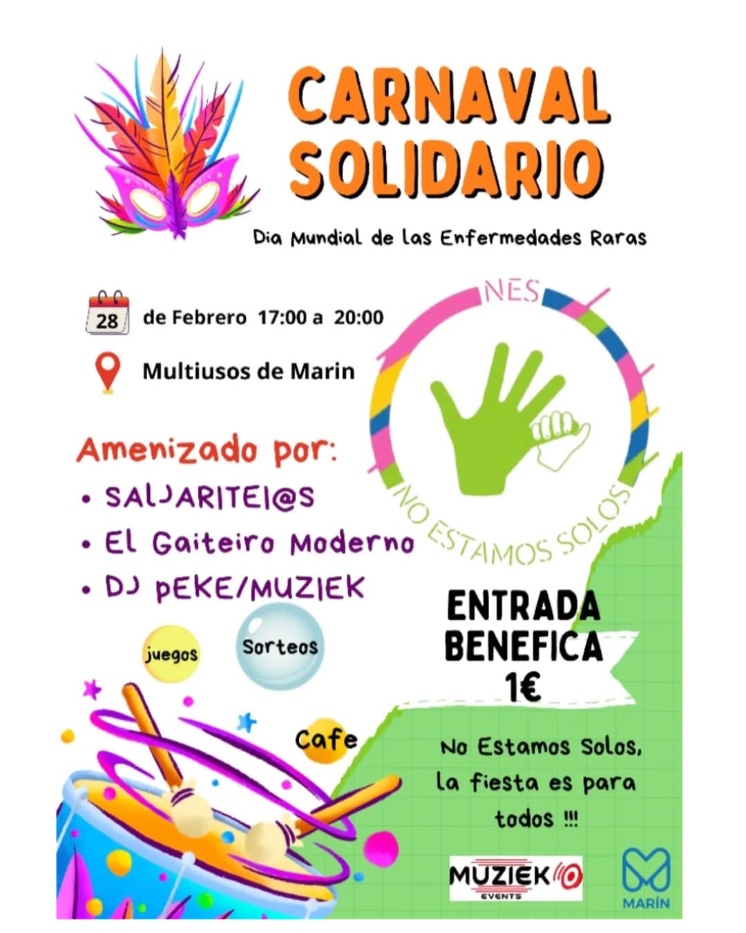 El programa general del Entroido marinense contará con una jornada especialmente entrañable porque el Multiusos del Mercado acocerá la celebración del “Carnaval Solidario” a beneficio de la entidad “No Estamos Solos” y con motivo del “Día Mundial de las Enfermedades Raras.