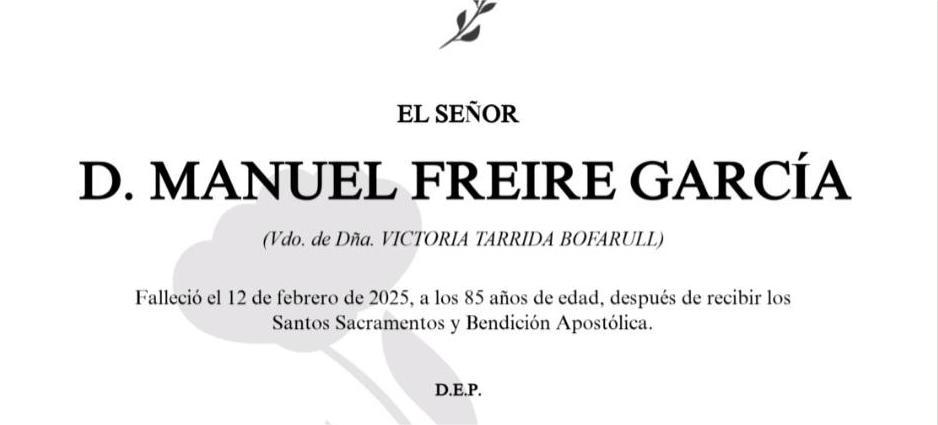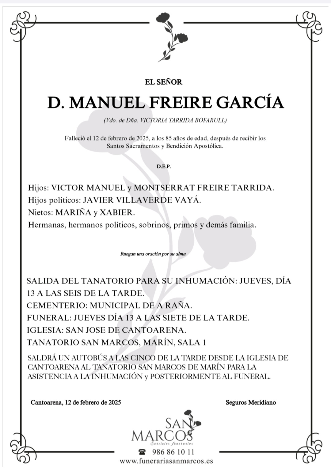 La funeraria SAN MARCOS comunica el fallecimiento ayer día 12 de febrero, de Don MANUEL FREIRE GARCÍA cuyos restos mortales permanecerán en el Tanatorio San Marcos, de Marín, sala número 1, hasta el momento de su traslado, HOY jueves día 13, a las seis de la tarde para su inhumación en el Cementerio Municipal de A Raña.