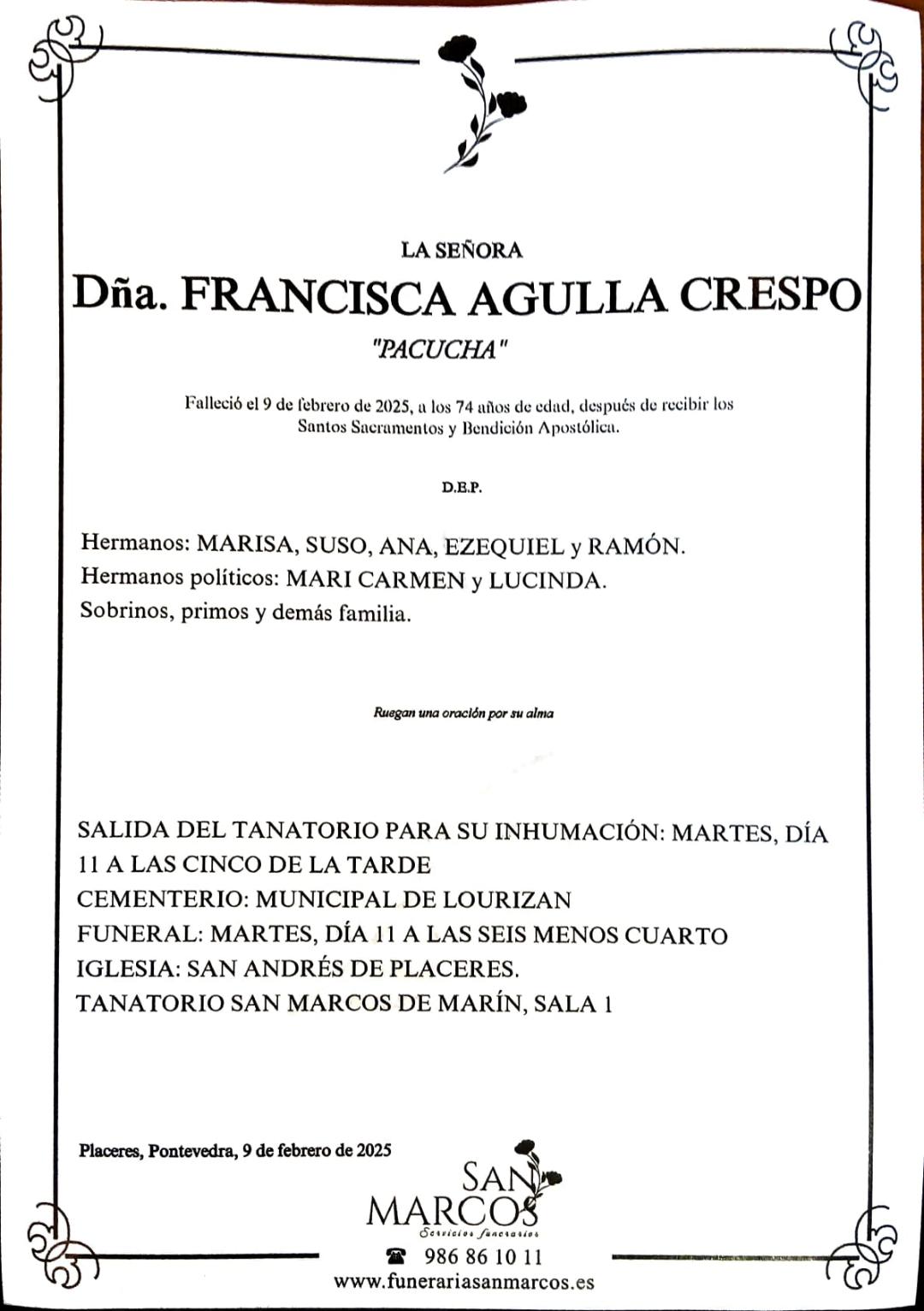 La funeraria SAN MARCOS comunica el fallecimiento ayer día 9 de febrero, de Doña FRANCISCA AGULLA CRESPO cuyos restos mortales permanecerán en el Tanatorio San Marcos, de Marín, sala número 1, hasta el momento de su traslado, mañana martes día 11, a las cinco de la tarde para su inhumación en el Cementerio Municipal de Lourizán.