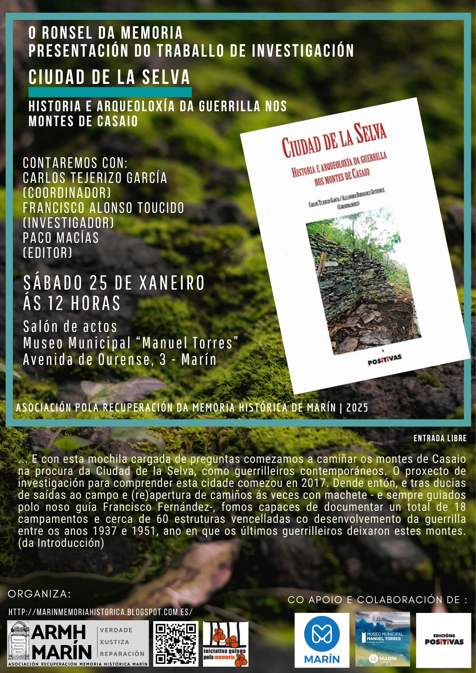 O vindeiro sábado día 25 de xaneiro, ás 12:00 h. no salón de actos do Museo Municipal Manuel torres, terá lugar a presentación do libro “Ciudad de la Selva, Histpria e Arqueoloxía da Guerrilla nos Montes de Casaio”, organizada pola Asociación pola Recuperación da Memoria Histórica de Marín.