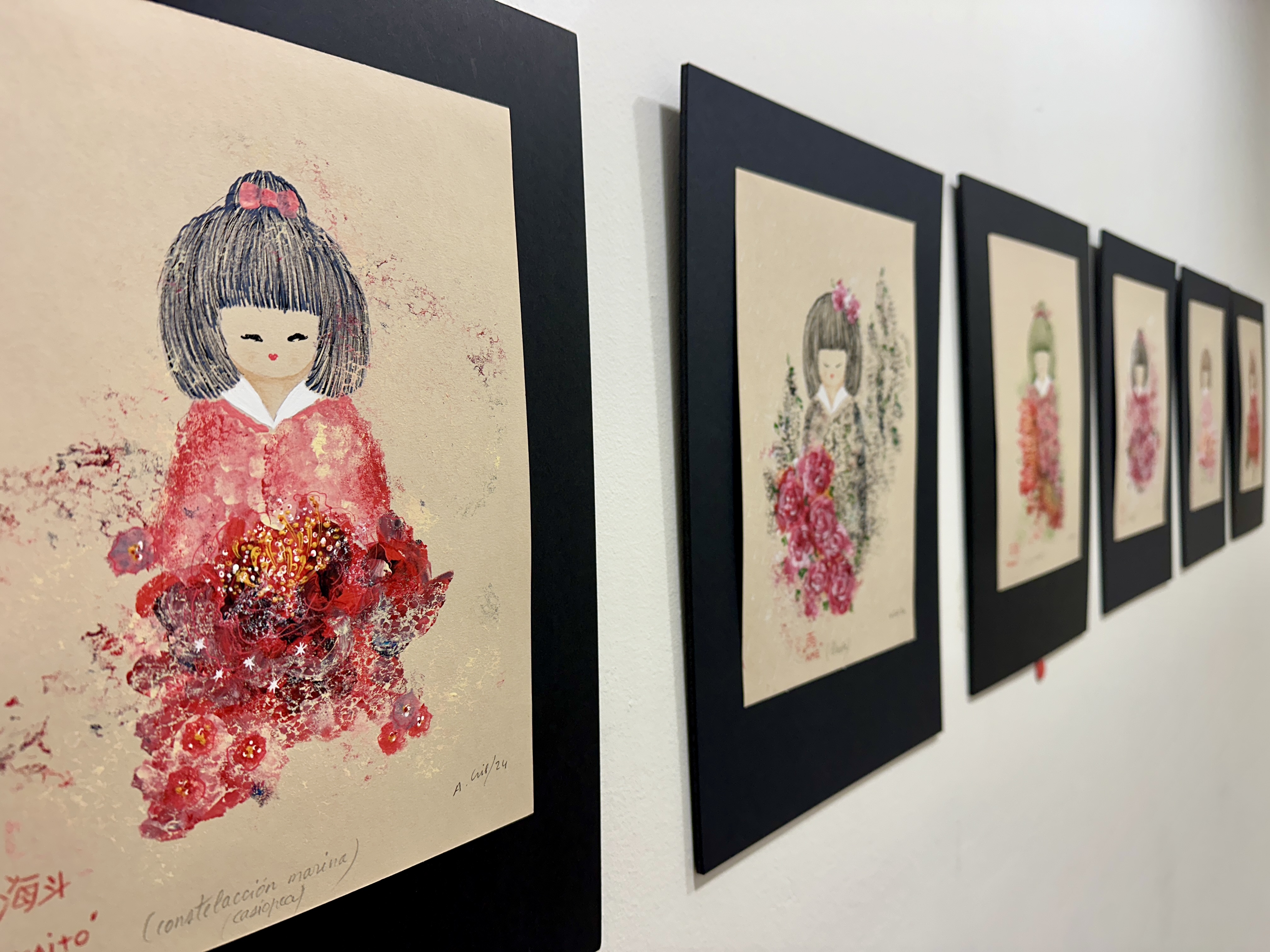 Rosa Crespo, une en la muestra su pasión por esta flor y por Japón, para crear una sucesión de muñecas “kokeshi” engalanadas con camelias y otros elementos relacionados con la cultura y naturaleza del país del sol.