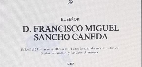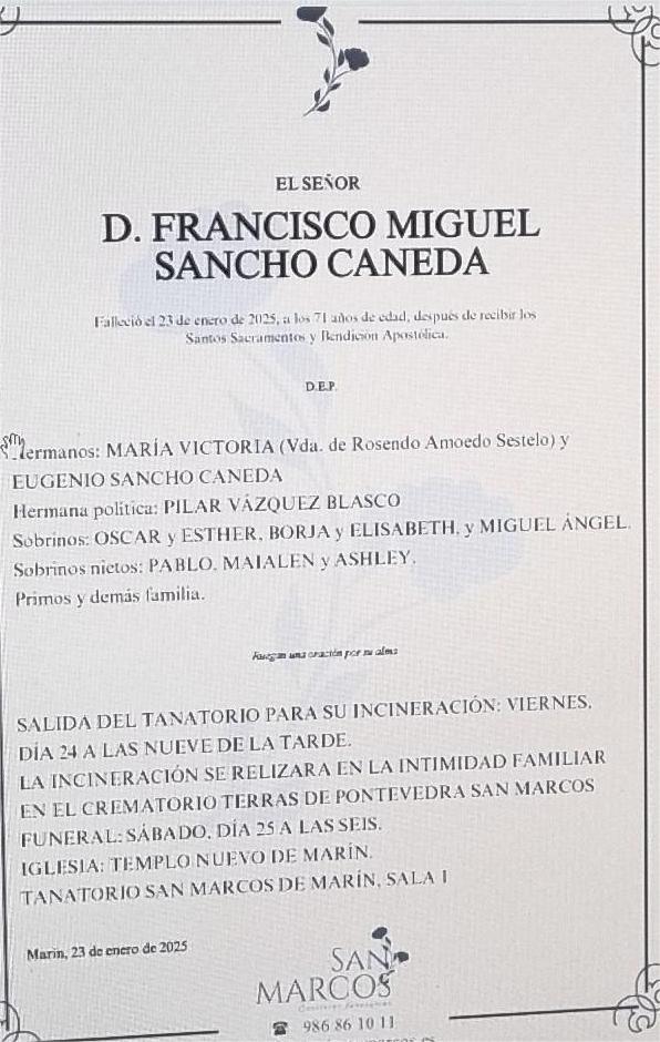 La funeraria SAN MARCOS comunica el fallecimiento en el día de ayer, de D.Francisco Miguel Sancho Caneda cuyos restos mortales permanecen en el Tanatorio San Marcos de Marín, sala número 1 hasta el momento de su traslado, hoy viernes, día 24, a las nueve de la tarde, al crematorio Terras de Pontevedra para su incineración en la intimidad familiar