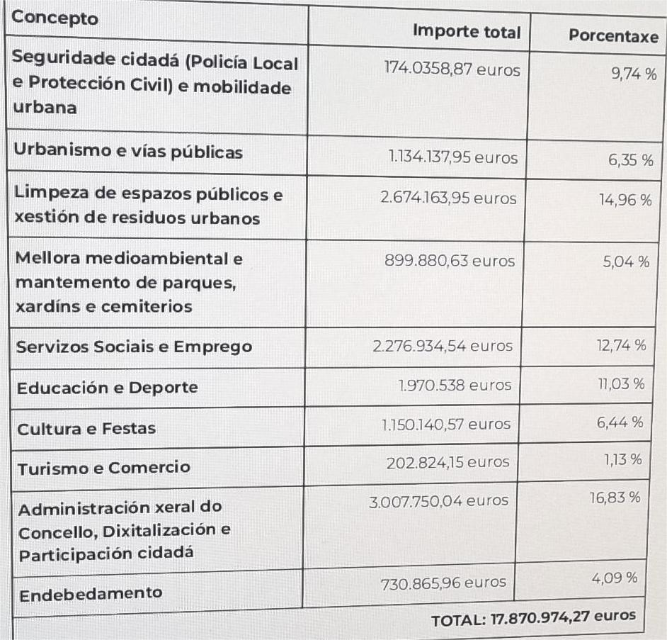 La desestimación segura, salvo hecatombe politica por las alegaciones presentadas, provocará la aprobación definitiva del Presupuesto cuya cuantía aumenta en un 9,6% con respecto al ejercicio anterior y según recuerdan desde el concello “O incremento de tres contratos claves na prestación de servizos públicos esenciais é o gran motivo tras a suba. O Servizo de Axuda no Fogar, o contrato de xestión da Piscina Municipal e a previsón de aumento do contrato de Xestión dos Residuos Sólidos Urbanos, que aumentan as partidas destinadas a estos fins”.
