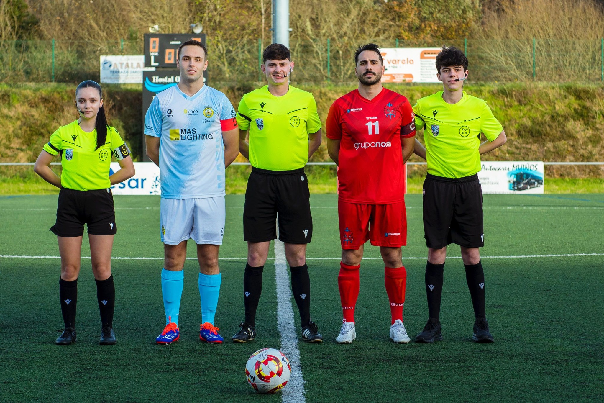 Árbitro : Lombao González con Marco Lamela y Lucia Otero (Colegio de Santiago ) . Amonestó a Centola , Rebo , Sabiola y Chuso por el bando local y a Dani Taracido , Xocas y David Veiga por bando visitante .