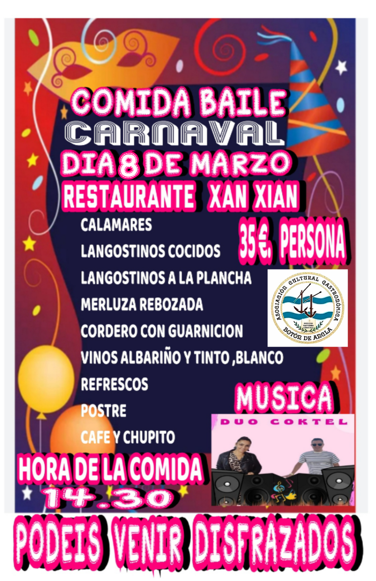 La primera actividad del programa diseñado por la “Asociación Cultural y Gastronómica Botón de Ancla” tendrá lugar en el mes de marzo, concretamente el sábado 8, cuando en pleno Entroido organiza la “comida baile”· en el Restaurante “Xan Xián”.