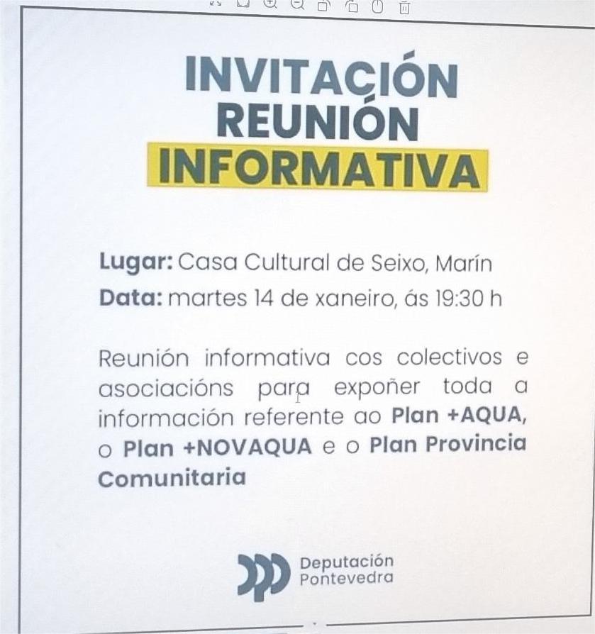Tras la puesta en marcha de las mejoras en las traídas comunales de aguas que tuvo lugar días atrás en Ardán y Moledo, hoy, tal como anunció el diputado Tourís presente en aquel acto, tendrá lugar una reunión informativa en la Casa de Cultura de Seixo donde se tratarán con los colectivos vecinales interesados que asistan a la misma temas relativos a los planes “+Agua” y “Provincia Comunitaria” y aspectos relativos a la nueva convocatoria que está en proceso de presentación de solicitudes para recibir fondos relativos a esta misma materia La reunión dará comienzo a las siete y media de la tarde en la sala principal de la Casa de Cultura de Seixo.