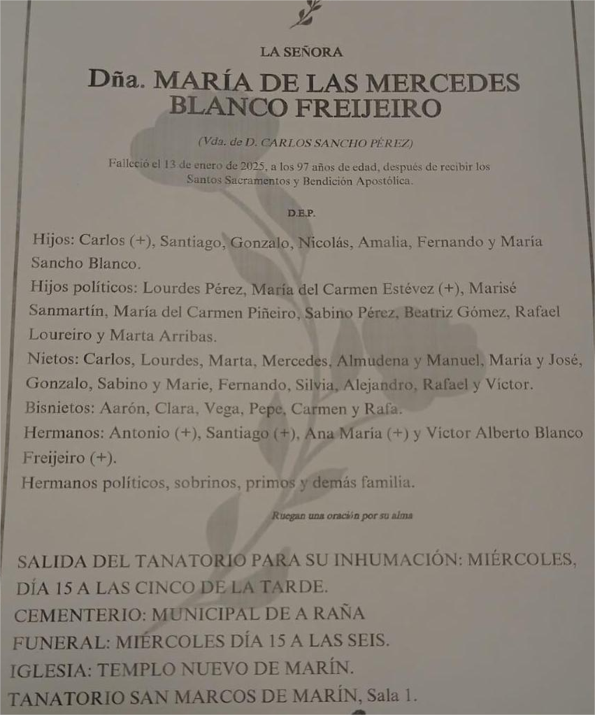 La familia de doña MARÍA DE LAS MERCEDES BLANCO FREIJEIRO comunica su fallecimiento en el día de hoy,13 de enero, cuyos restos mortales se velan en la sala número 1 del Tanatorio San Marcos de Marín, de donde se trasladarán el próximo miércoles día 15 a las cinco de la tarde al cementerio municipal de A Raña para su inhumación .