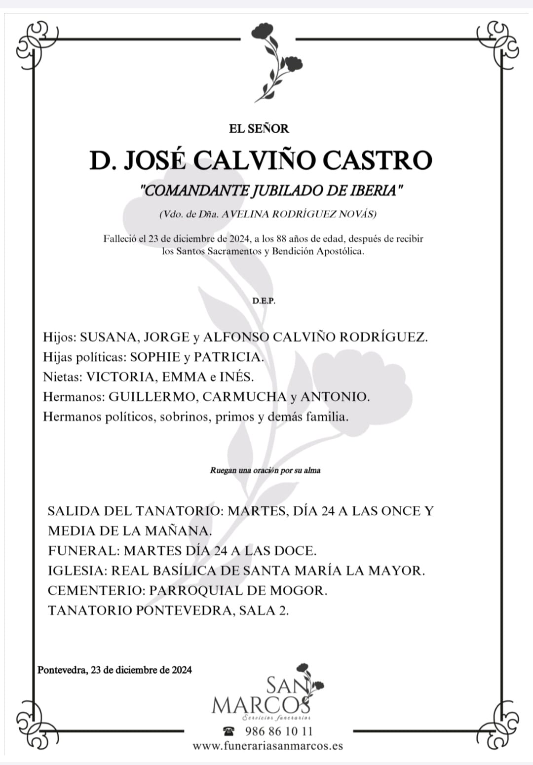 La funeraria SAN MARCOS comunica el fallecimiento, HOY día 23 de D0N. JOSÉ CALVIÑO CASTRO cuyos restos mortales permanecen en la sala número 2 de su tanatorio en Marín hasta el momento de su traslado, mañana MARTES día 24 a las ONCE Y MEDIA de la mañana.