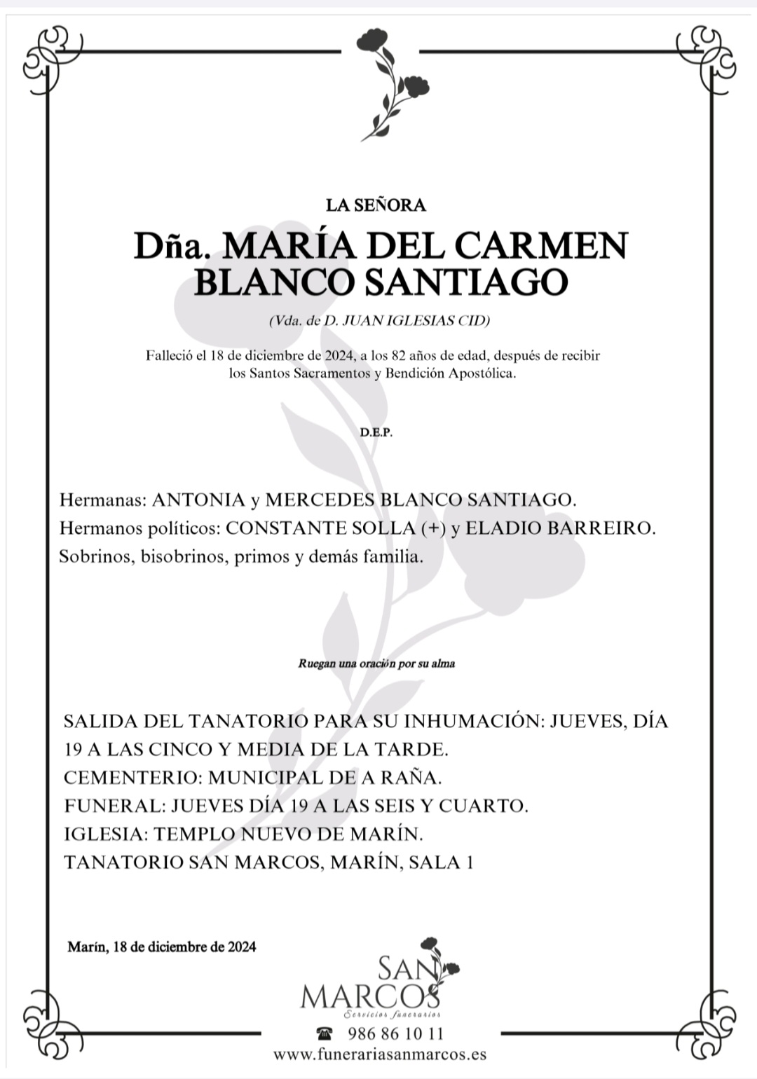 La funeraria SAN MARCOS comunica el fallecimiento, HOY día 18 de Dña. MARIA DEL CARMEN BLANCO SANTIAGO cuyos restos mortales permanecen en la sala número 1 de su tanatorio en Marín hasta el momento de su traslado, mañana JUEVES día 19 a las CINCO Y MEDIA de la tarde, al cementerio municipal de A Raña para su inhumación.