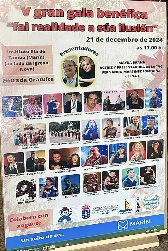 La Gala 'Haz realidad su ilusión', en ésta su quinta edición, se celebrará el próximo, sábado, día 21 de diciembre, a partir de las cinco de la tarde, en el Paraninfo del Instituto Illa de Tambo con entrada totalmente gratuita, aunque que solicita a los asistentes donen un juguete, nuevo o en buen estado. Los organizadores han comunicado que los juguetes que se recauden a las puertas de la gala serán enviados a Valencia para colaborar con las familias perjudicadas por la pasada DANA y en colaboración con el Concello de Marín.