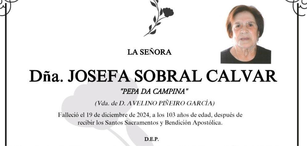 La funeraria SAN MARCOS comunica el fallecimiento, HOY día 19 de Dña. JOSEFA SOBRAL CALVAR cuyos restos mortales permanecen en su tanatorio en Marín hasta el momento de su traslado, mañana VIERNES día 20 a las CUATRO MENOS CUARTO de la tarde, al crematorio Terras de Pontevedra para su incineracion en la intimidad familiar.