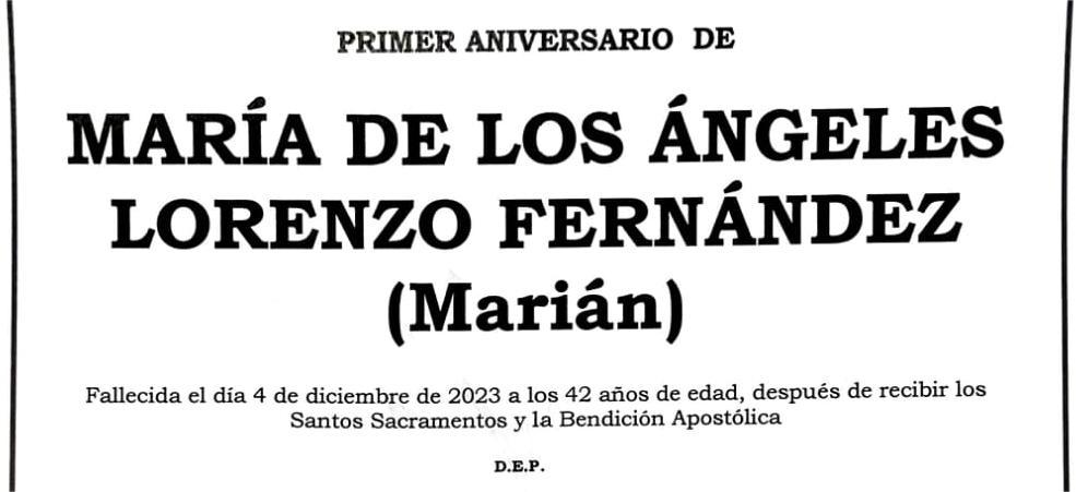 La funeraria SAN MARCOS comunica que MAÑANA jueves, día 5, tendrá lugar en el Nuevo Templo de Marín, a las SEIS de la tarde el funeral de primer aniversario por el alma de MARÍA DE LOS ÁNGELES LORENZO FERNÁNDEZ, fallecida el día 4 de diciembre de 2023 a los 42 años de edad D.E.P.