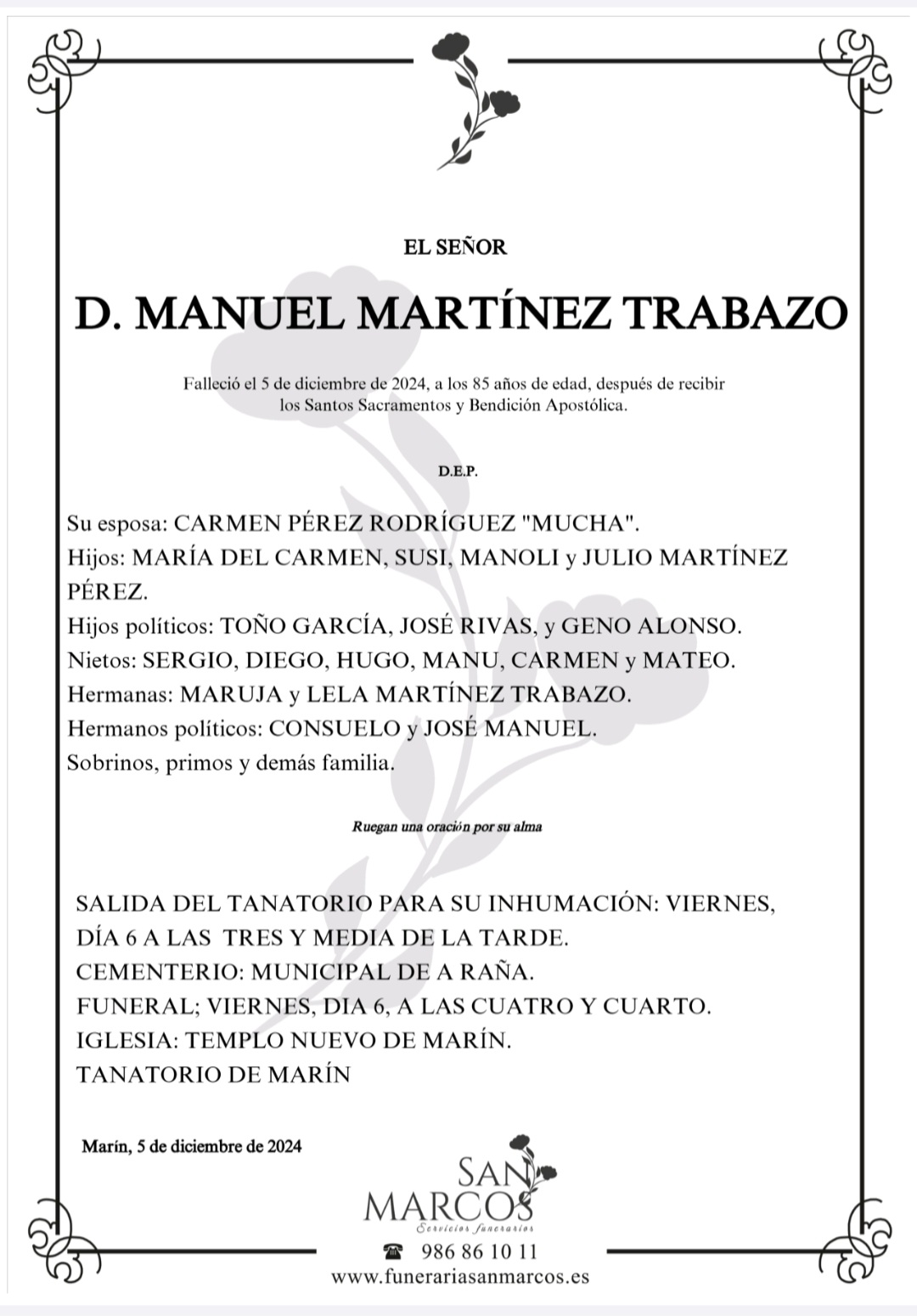 La funeraria SAN MARCOS comunica el fallecimiento, hoy día 5 de Don MANUEL MARTÍNEZ TRABAZO, cuyos restos mortales se velan en tanatorio San Marcos de Marín hasta el momento de su traslado, mañana viernes, día 6 a las TRES Y MEDIA de la tarde al cementerio municipal de A Raña para su inhumación.