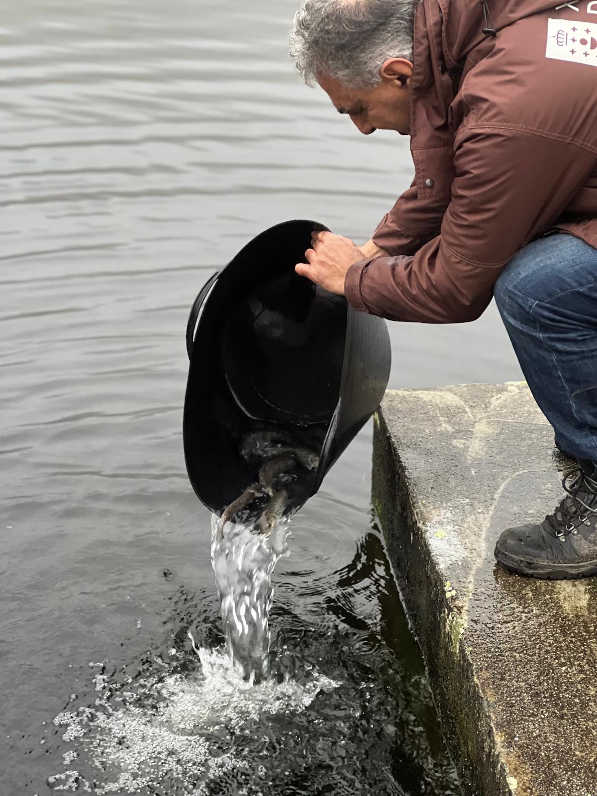 Un operario se encargó de dejar caer sobre las tranquilas aguas del Lago los ejemplares de truchas adultas que se amoldarán pronto a su nueva “casa” devolviendo la vida al Lago que acoge a este medio millar de peces en su recinto.