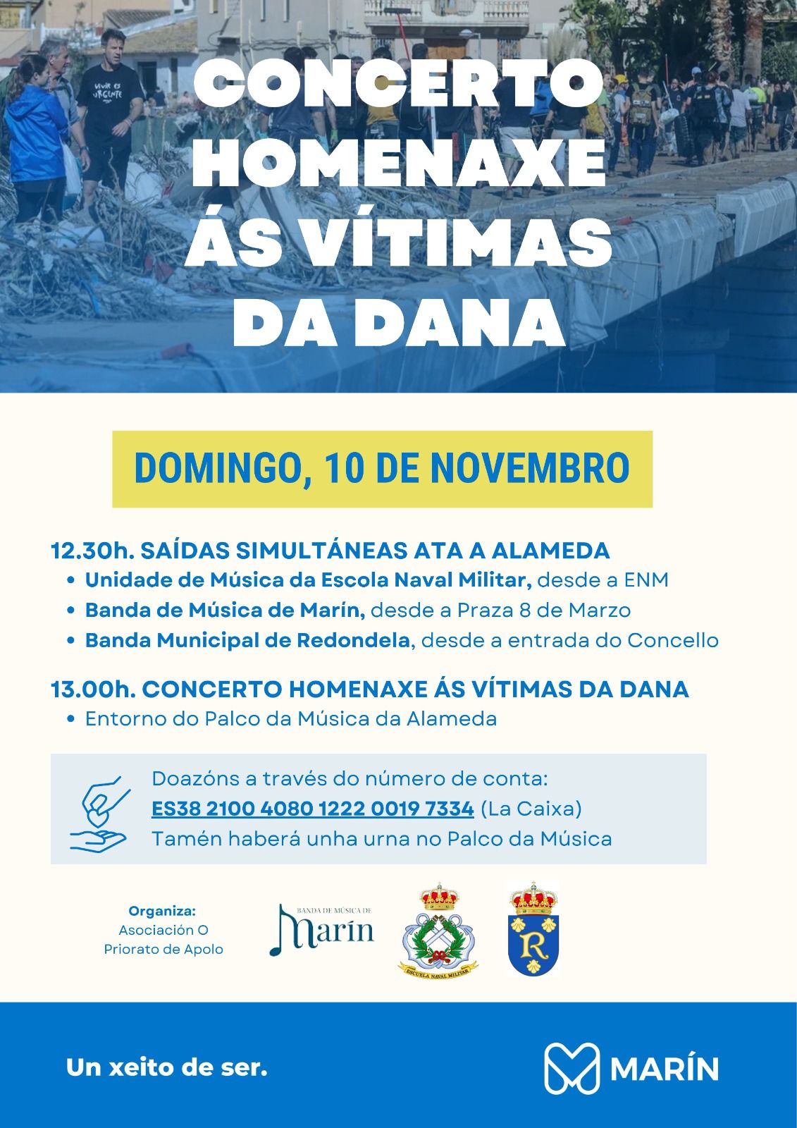 Tres bandas de Música: la de Marín, la de Redondela y la de la Escuela Naval Militar, se unen este próximo domingo en un acto de homenaje a las victimas de la Dana en el Levante Español con intención de generar donaciones para los damnificados