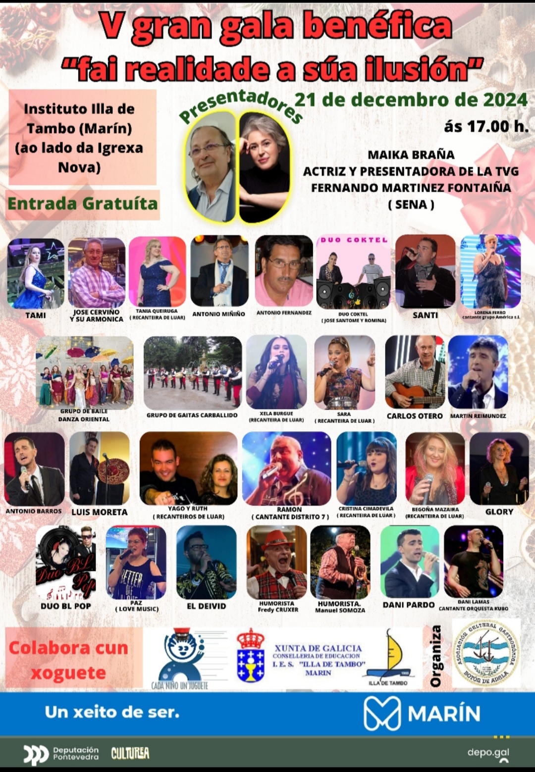 Como cada año “Botón de Ancla” organiza un festival en el paraninfo del Instituto Illa de Tambo en el que comparecen numerosos artistas que colaboran decididamente con la causa. “En total - informa Area Extremera - el programa contendrá 28 actuaciones de cantantes, humoristas y músicos y la presentación correrá a cargo de la actriz local Mayka Braña y de Fernando Martínez.