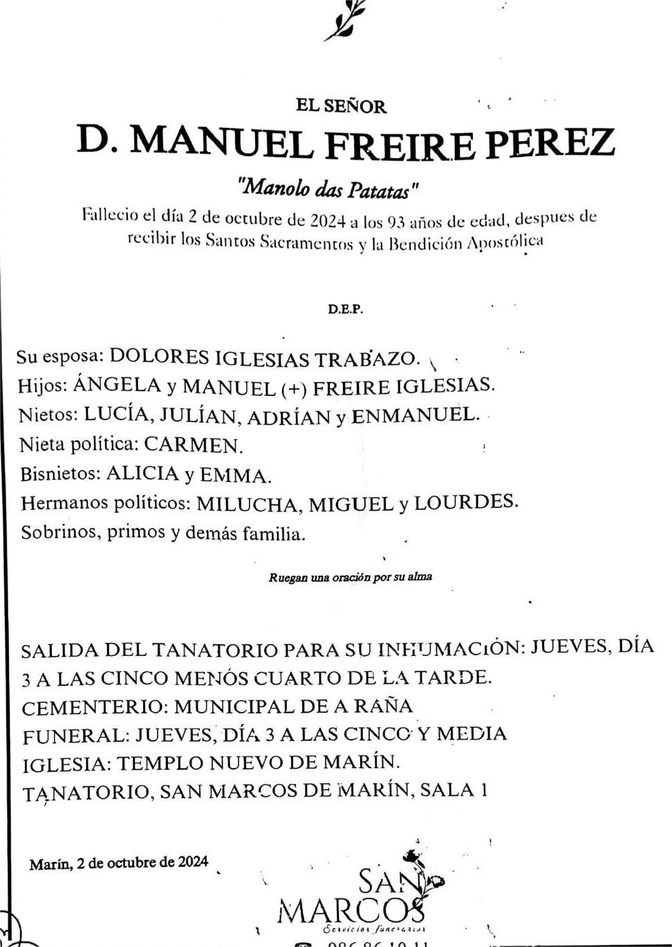 La funeraria San Marcos comunica el fallecimiento, hoy miércoles día 2, de Don MANUEL FREIRE PÉREZ cuyos restos mortales se velen en la sala número 1 del Tanatorio San Marcos de Marín, hasta el momento de su salida, mañana JUEVES día 3, a las CINCO MENOS CUARTO de la tarde para su inhumación en el cementerio municipal de A Raña.