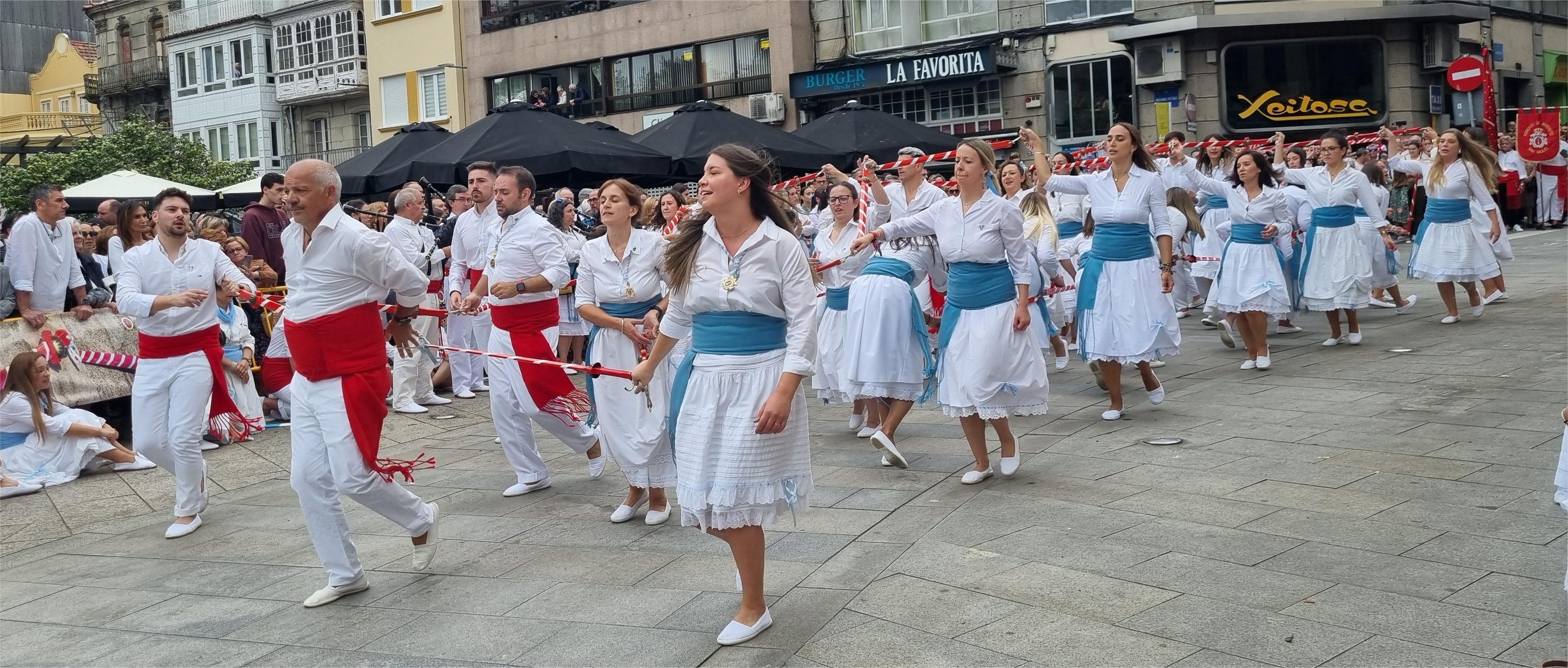 y también el veterano grupo “Meigas e Trasgos” que puso el final bailando en la Plaza del Reloj lugar que atesora el sentido más tradicional de esta manifestación religiosa ya que antiguamente, en muchas ocasiones, la procesión solo rodeaba el antiguo templo y era en la plaza del reloj donde los mareantes hacían honor al Santo interpretando la danza en el más puro estilo de la época.