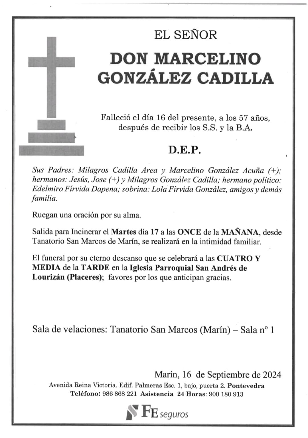 La funeraria La Fe comunica el fallecimiento, hoy domingo, de Don MARCELINO GONZÁLEZ CADILLA cuyos restos mortales se velen en la sala número 1 del Tanatorio San Marcos de Marín, hasta el momento de su salida, mañana MARTES día 17, a las ONCE de la mañana para su incineración en la intimidad familiar.