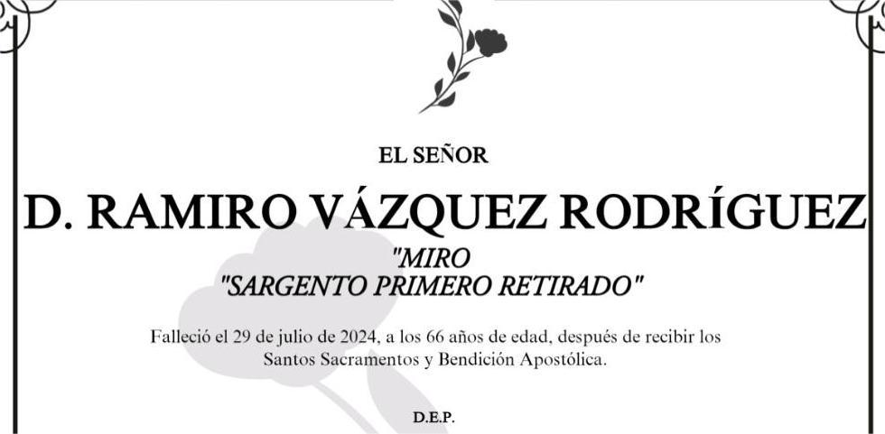 La funeraria SAN MARCOS comunica que, en la sala número 2 del tanatorio en Marín, se velan los restos mortales de DON Ramiro Vázquez Rodríguez “Miro”, fallecido ayer día 29, hasta el momento de su traslado para su inhumación en el cementerio de A Raña MAÑANA MIÉRCOLES día 31, a las SEIS Y CUARTO de la TARDE.