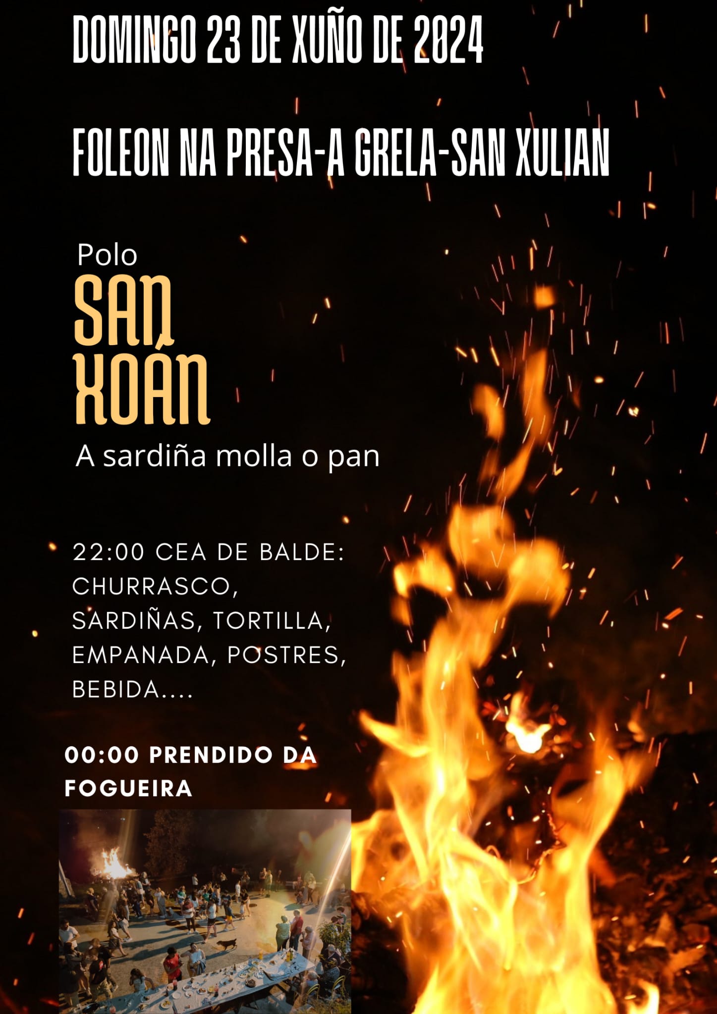 Los organizadores invitan a cualquier persona que se quiera unir a disfrutar de un agradable momento en compañía de familiares y amigos y hoy, a partir de las 22:00 de la noche en el lugar de A Presa-A Grela podrán disfrutar gratuitamente de sardinas, churrasco, empanada, tortilla, bebida, postres, café etc. Situándose el encendido de la hoguera en las 00:00 de la noche