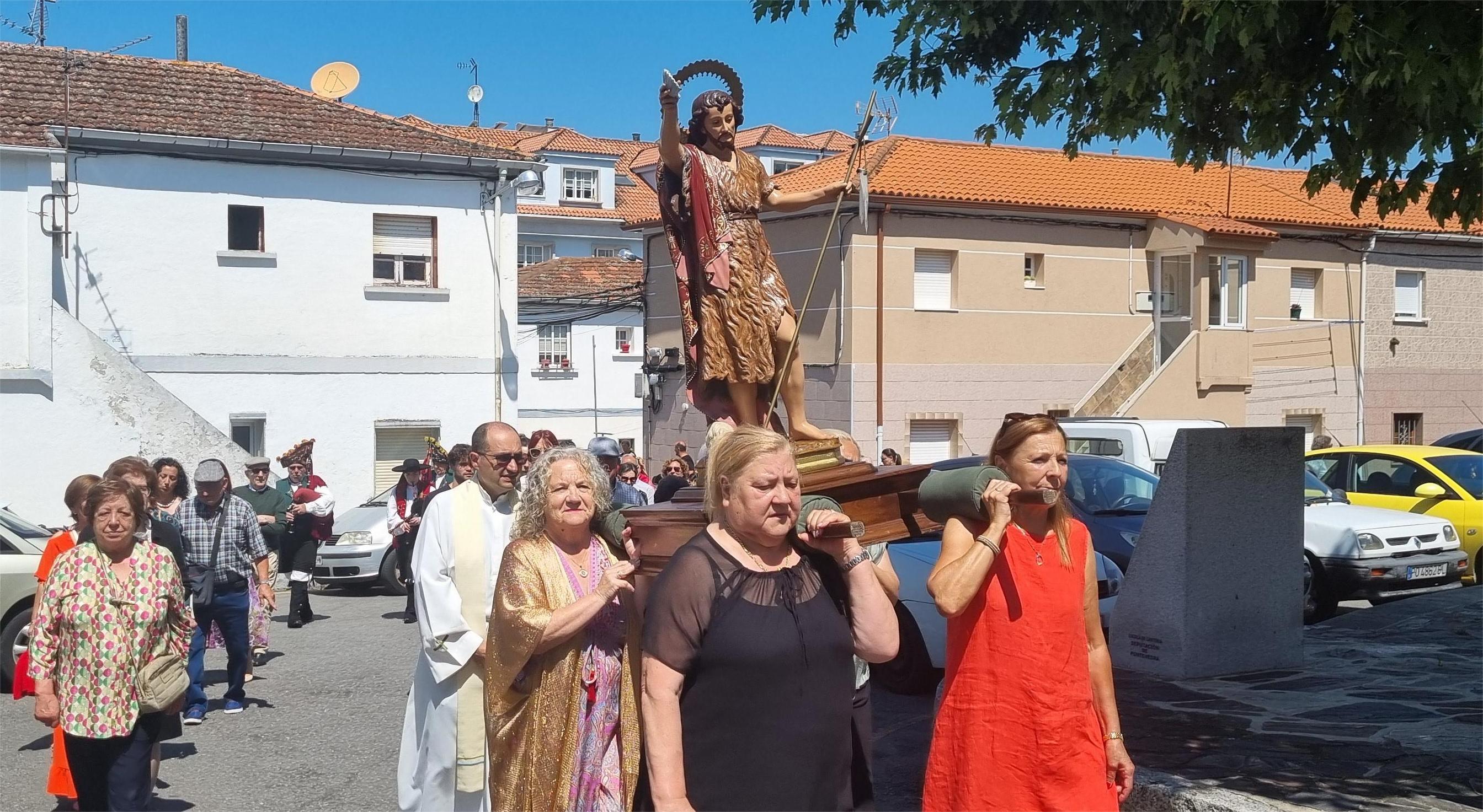 Un sol de justicia, como suele decirse cuando la intensidad solar es poco resistible, no impidió que saliera la procesión de San Juan por el barrio de La Cañota aunque con un recorrido más corto de lo habitual. La comitiva contó con vecinos del entorno, con los que compartieron la celebración la alcaldesa María Ramallo y la concejala Marián Sanmartin ligada al barrio de donde fue vecina durante muchos años. El grupo folclórico “Trompos ós Pes” cerraba la comitiva y, al final de la procesión ofrecía un concierto con danza de sus alumnos más jóvenes.
