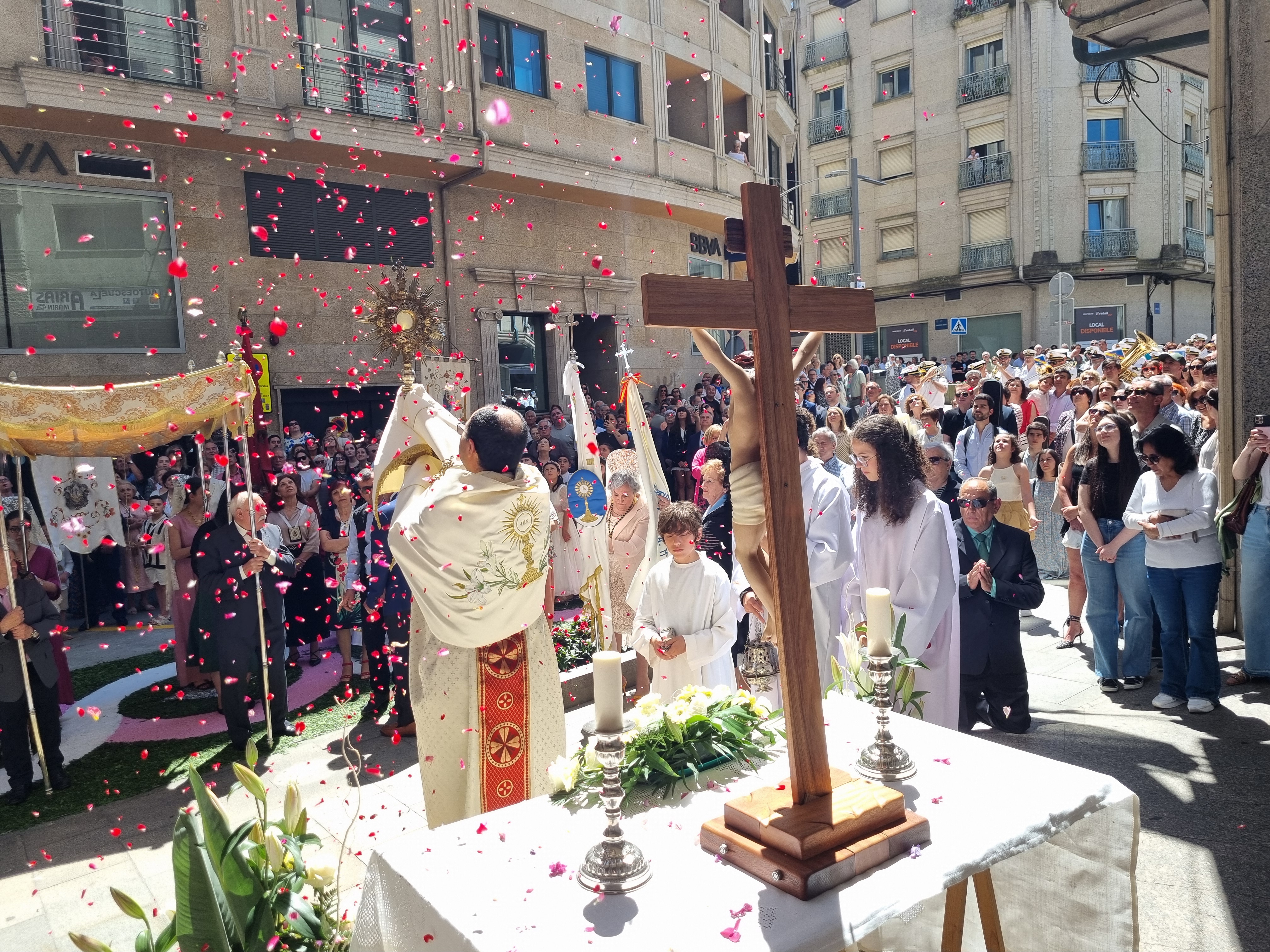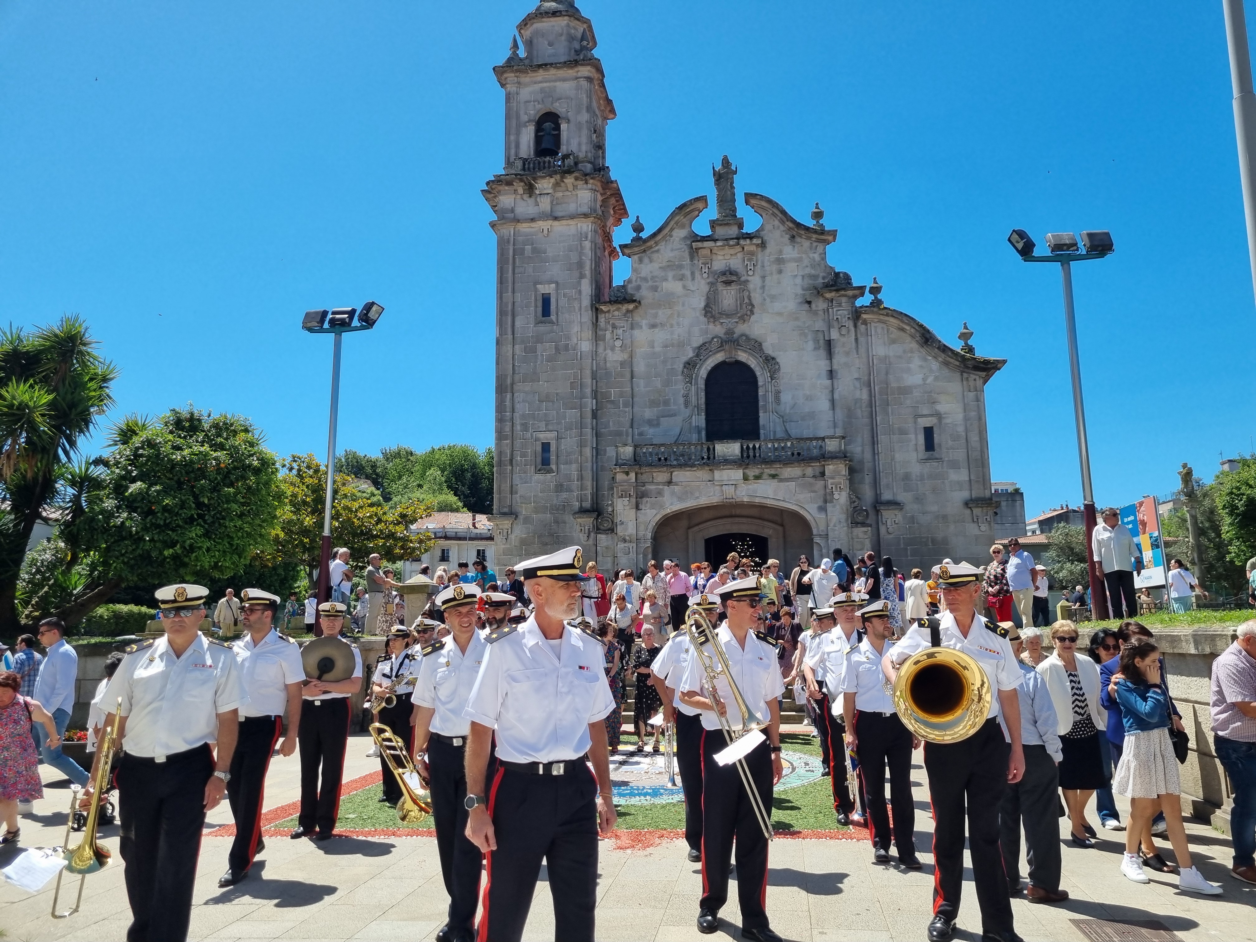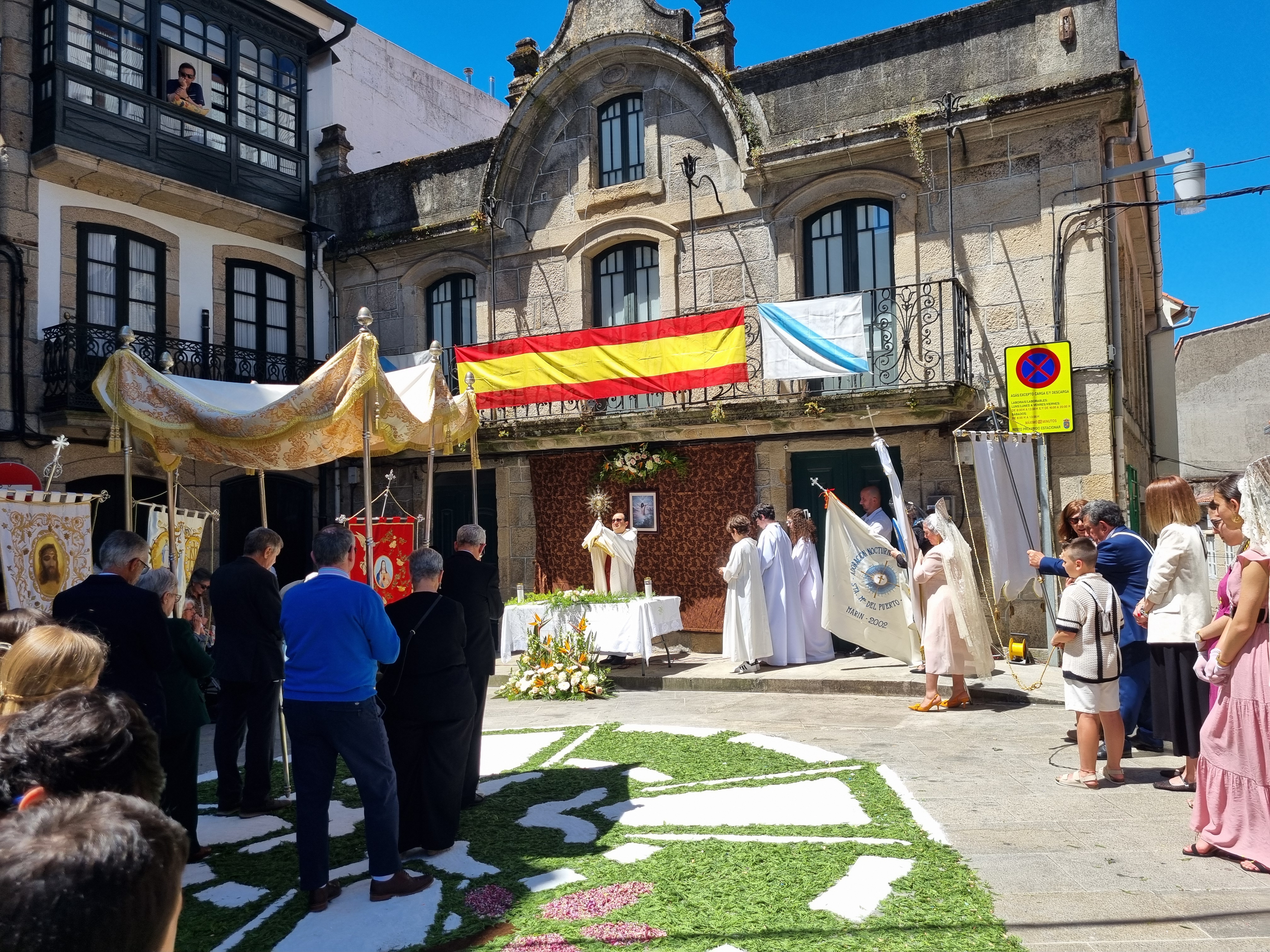 Era la una de la tarde del domingo cuando, una vez concluida la misa salió la procesión de Corpus Cristi que recorrió las calles de Marín hasta el templo antiguo. Alfombras florales decoraban el recorrido, desde el atrio parroquial hasta la Rúa do Sol, pasando por Concepción Arenal, Jaime Janer y Rúa Real