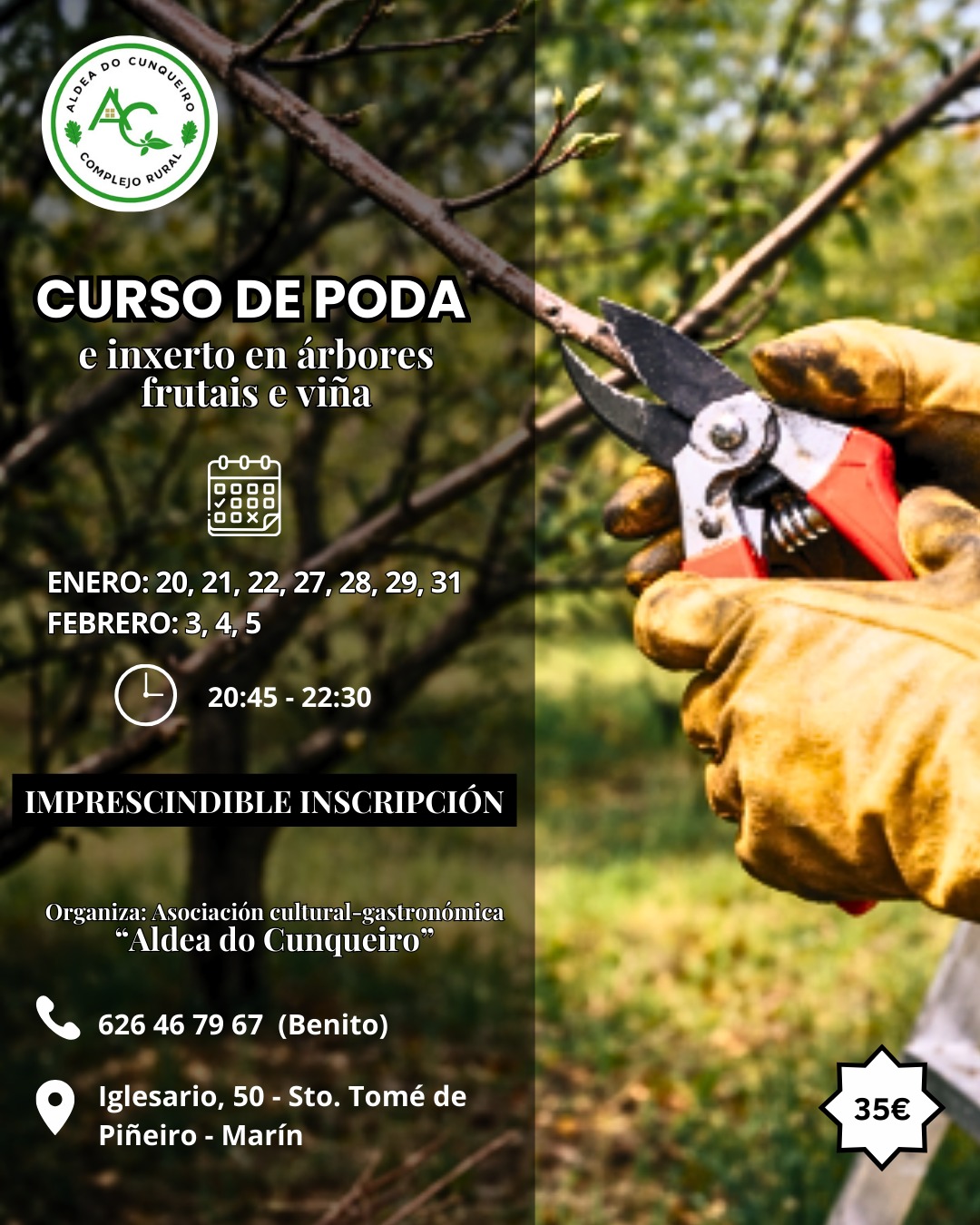 La asociación cultural-gastronomica "Aldea do Cunqueiro" organiza un curso sobre "Poda e injerto de árboles frutales". En el cual se mostrarán las diferentes técnicas que existen para la poda y el injerto y será básicamente práctico y, al final del curso, habrá una jornada de campo donde los alumnos aplicarán los conocimientos adquiridos.