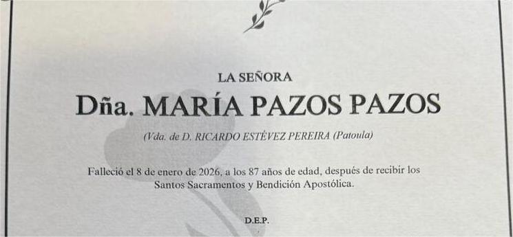 La funeraria SAN MARCOS comunica el fallecimiento HOY, día 8 de enero, de Doña MARÍA PAZOS PAZOS cuyos restos mortales permanecerán en el tanatorio San Marcos, de Marín, sala número 1, hasta el momento de su traslado, mañana viernes día 9 a las cuatro de la tarde al cementerio municipal de A Raña .