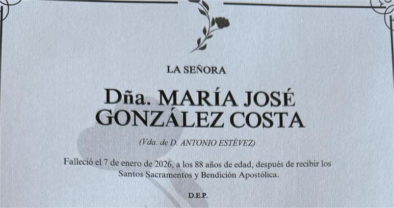 La funeraria SAN MARCOS comunica el fallecimiento ayer, día 7 de enero, de Doña MARÍA JOSÉ GONZÁLEZ COSTA cuyos restos mortales permanecerán en el tanatorio San Marcos, de Marín, sala número 2, hasta el momento de su traslado, hoyjueves día 8 a las cuatro y cuarto de la tarde para su inhumación en el Cementerio Municipal de A Raña.