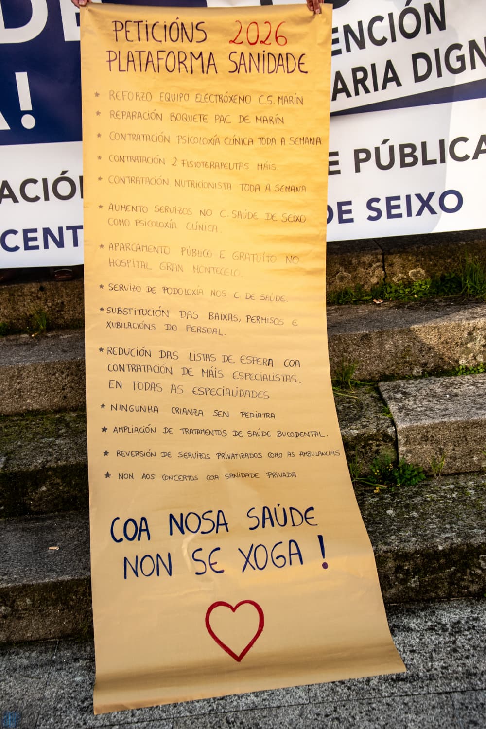 A Plataforma Seixo-Marín concentrouse diante do Hospital Provincial cun longo pergamiño de desexos a modo de carta dirixida ao xerente da área sanitaria, reclamando contratación de persoal para reducir as listas de agarda na atención primaria e especializada como os tres anos que están a esperar alguns veciños para uroloxía