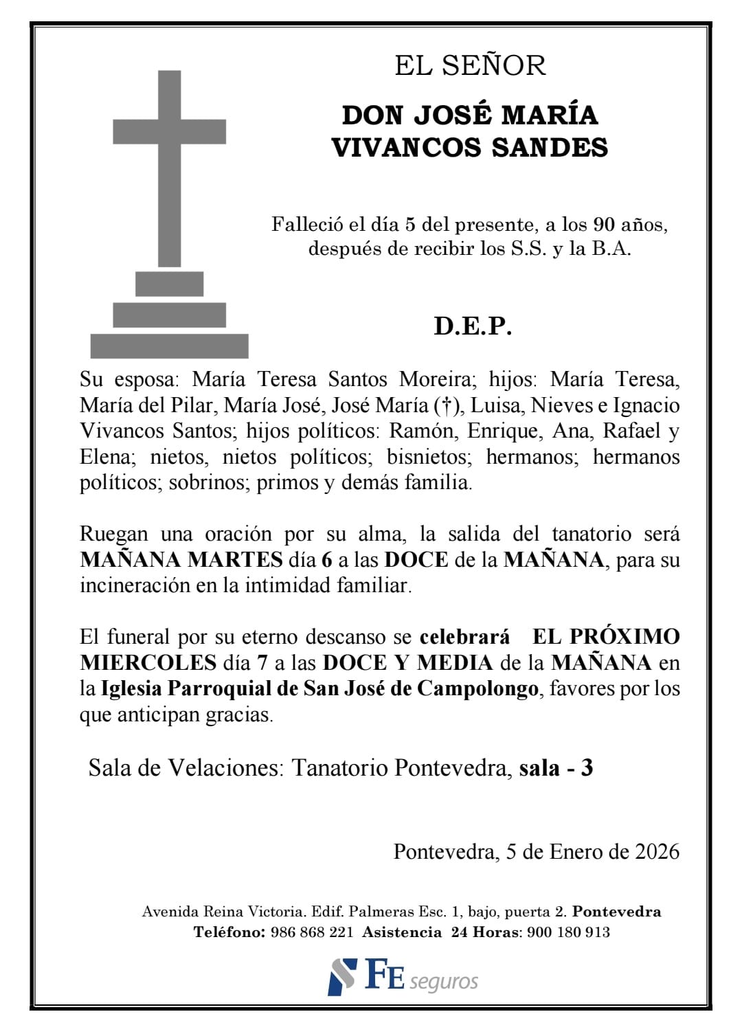La funeraria LA FE comunica el fallecimiento AYER, día 5 de enero, de Don JOSÉ MARÍA VIVANCOS SANDES cuyos restos mortales permanecerán en el tanatorio de PONTEVEDRA, sala número 3, hasta el momento de su traslado, HOY MARTES día 6 a las DOCE de la mañana para su incineración en la intimidad familiar.