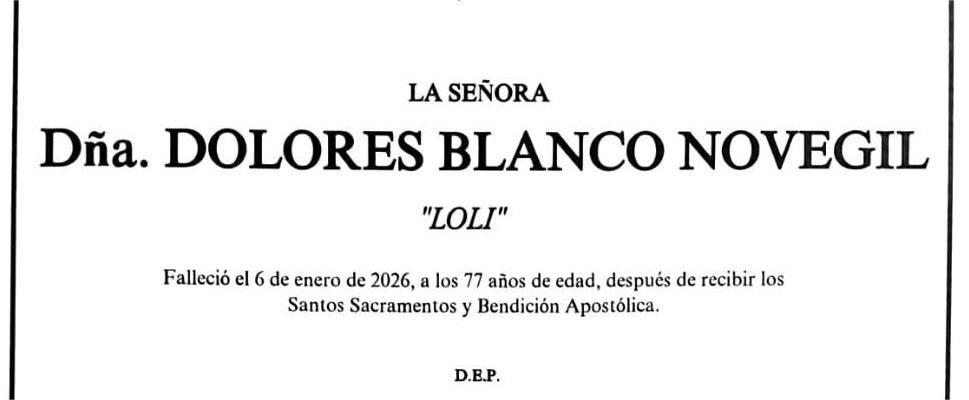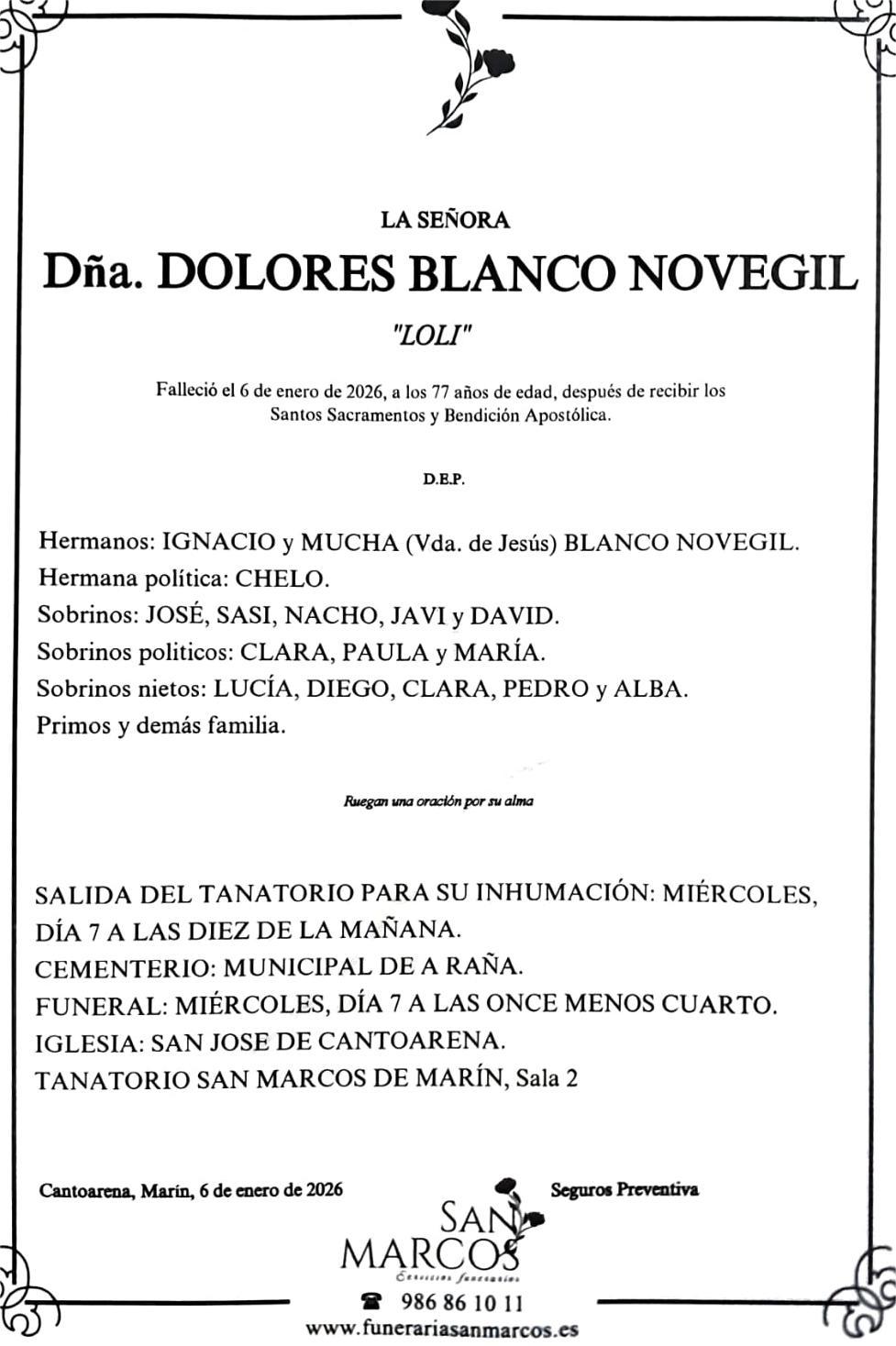La funeraria SAN MARCOS comunica el fallecimiento hoy, día 6 de enero, de Doña DOLORES BLANCO NOVEGIL cuyos restos mortales permanecerán en el tanatorio de San Marcos de Marín, sala número 2, hasta el momento de su traslado, mañana miércoles día 7 a las DIEZ de la mañana para su inhumación en el cementerio municipal de A Raña.