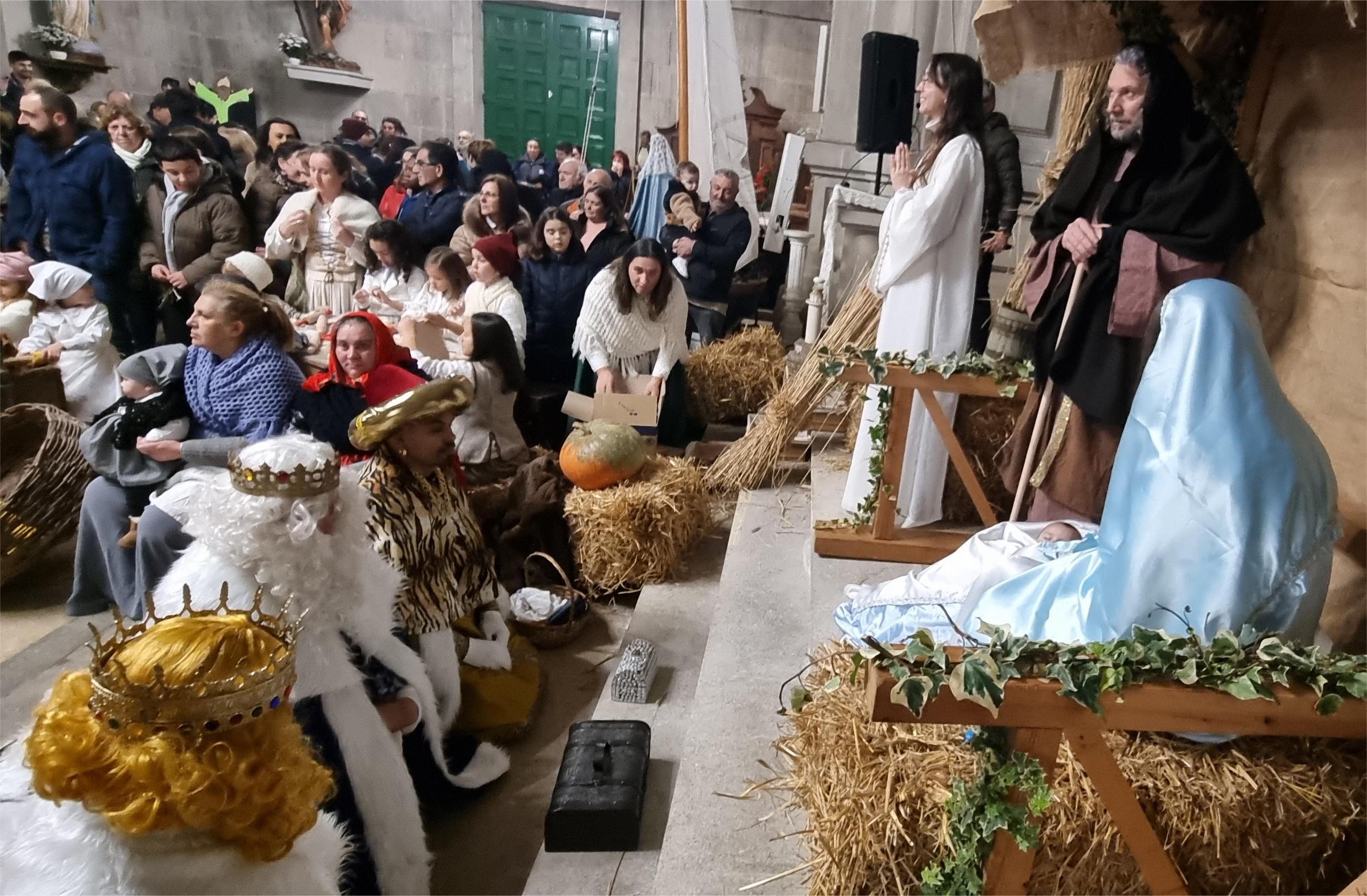 adoración al Niño en el Belén viviente que, como viene ocurriendo en los últimos años, se organiza en el Nuevo Templo con la colaboración de la asociación cultural “Os da Caña” de San Xulián, que ambientan el recinto donde, tras la referida adoración, los Reyes Magos saludarán a los niños y niñas que se les acerquen, si los nervios se lo permiten.