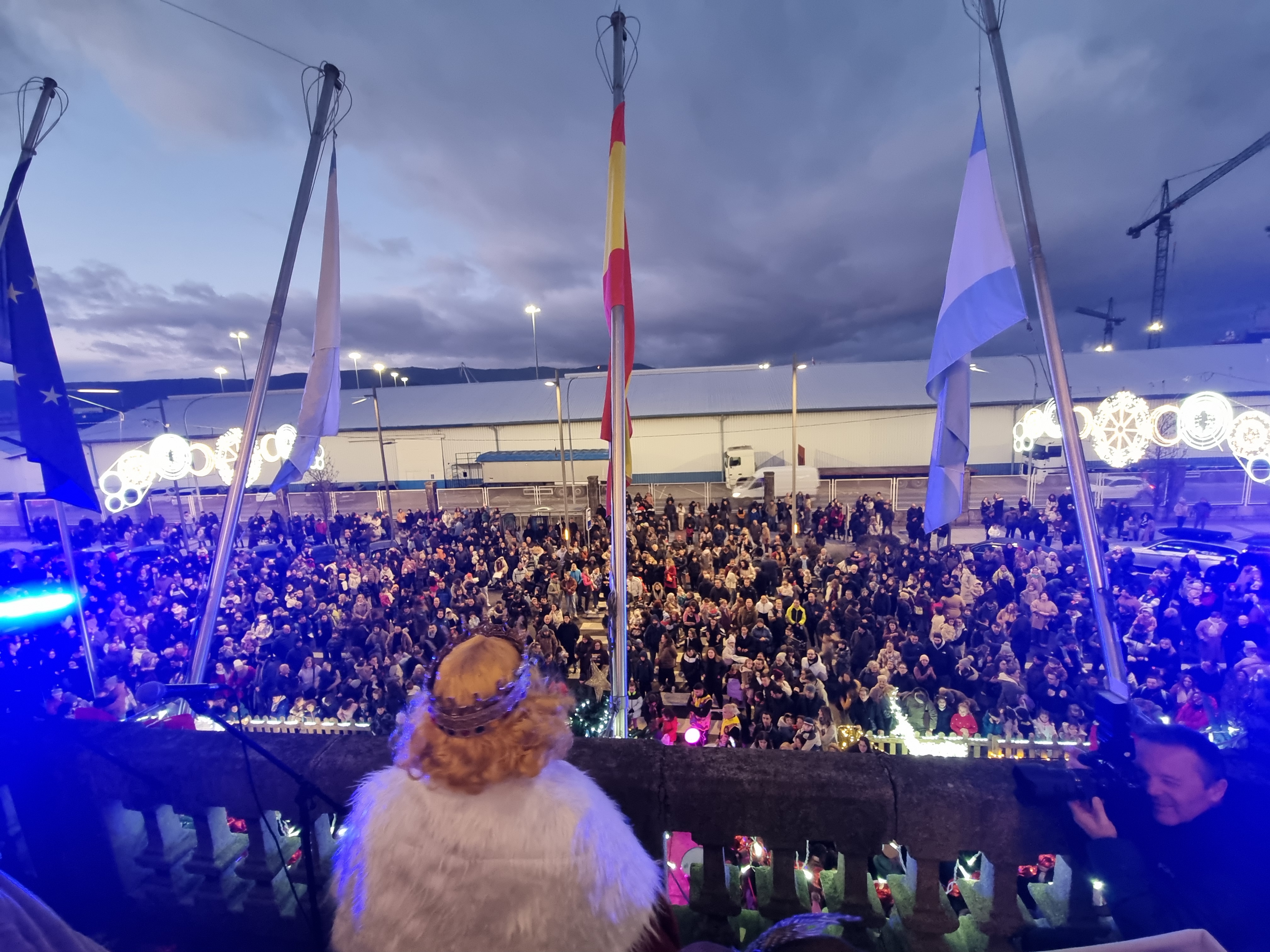 Los tres Magos acompañados de la alcaldesa María Ramallo salieron al balcón de la fachada principal del Concello y, desde allí, tras la presentación hecha por la regidora, los tres Magos dirigieron sendos breves discursos a los numerosos asistentes que llenaban la plaza.