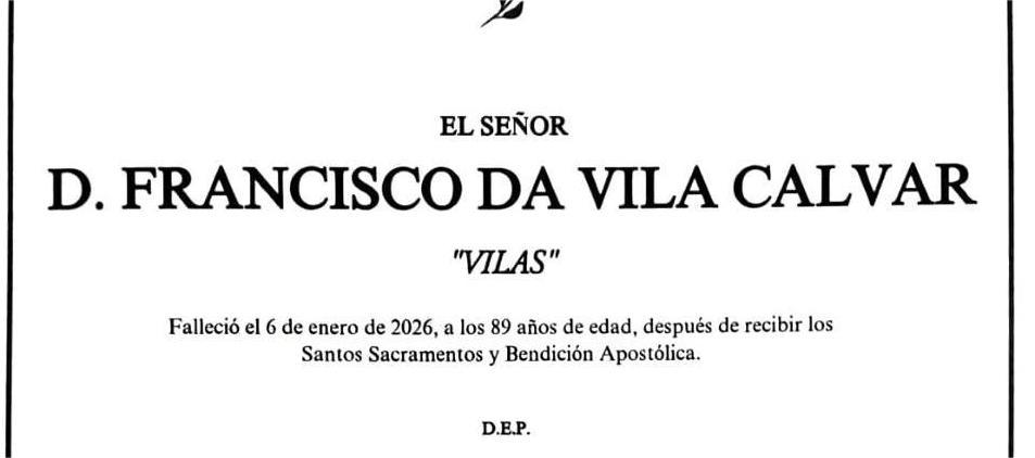 La funeraria SAN MARCOS comunica el fallecimiento HOY, día 6 de enero, de Don FRANCISCO DA VILA CALVAR cuyos restos mortales permanecerán en el tanatorio San Marcos, de Marín, sala número 1, hasta el momento de su traslado, mañana miércoles día 7 a las cuatro de la tarde para su inhumación en el Cementerio Municipal de A Raña.