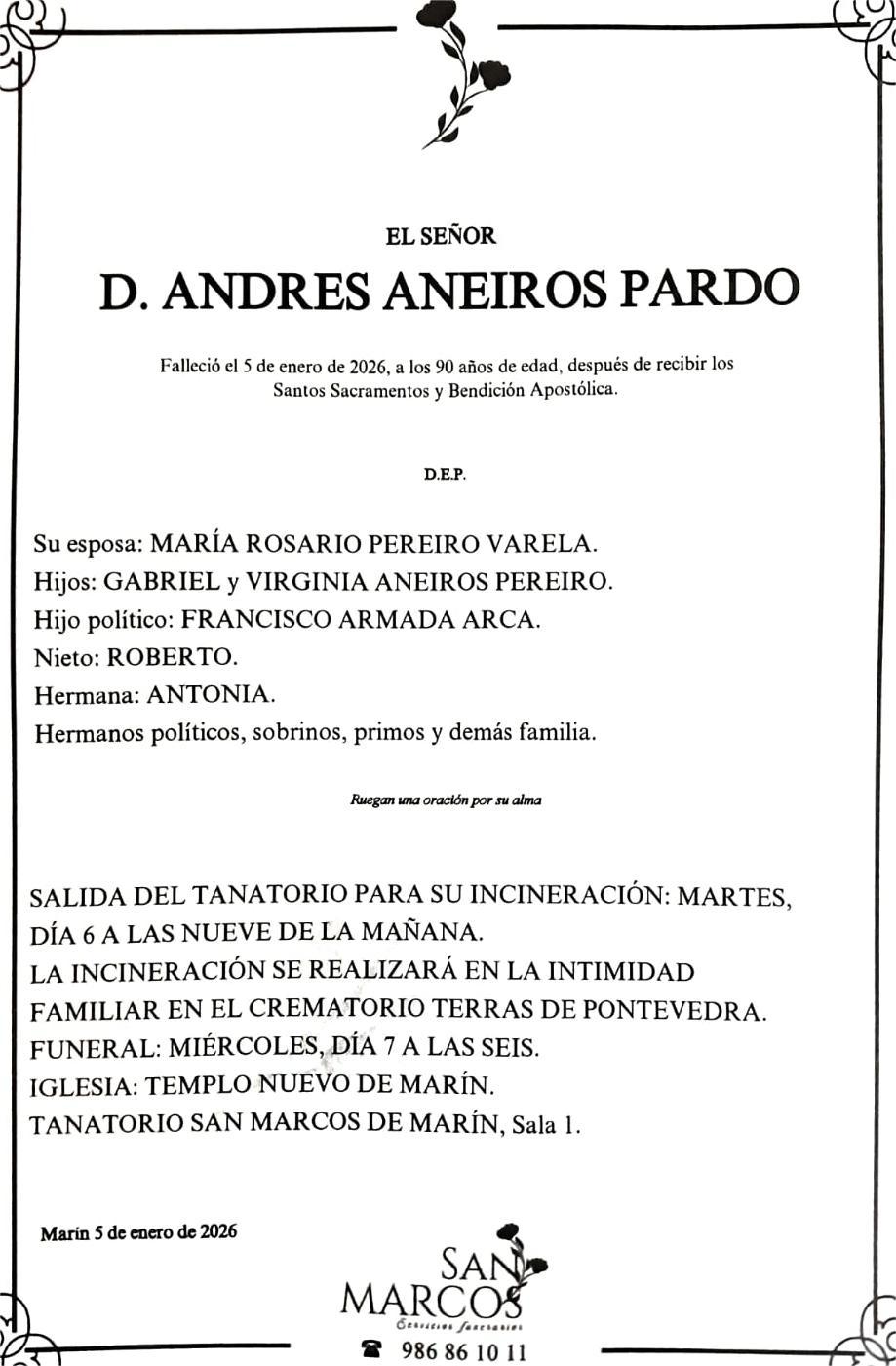 La funeraria SAN MARCOS comunica el fallecimiento hoy, día 5 de enero, de Don ANDRÉS ANEIROS PARDO cuyos restos mortales permanecerán en el tanatorio San Marcos de MARÍN, sala número 1, hasta el momento de su traslado, MAÑANA MARTES día 6 a las NUEVE de la mañana para su incineración en la intimidad familiar en el crematorio Terras de Pontevedra.