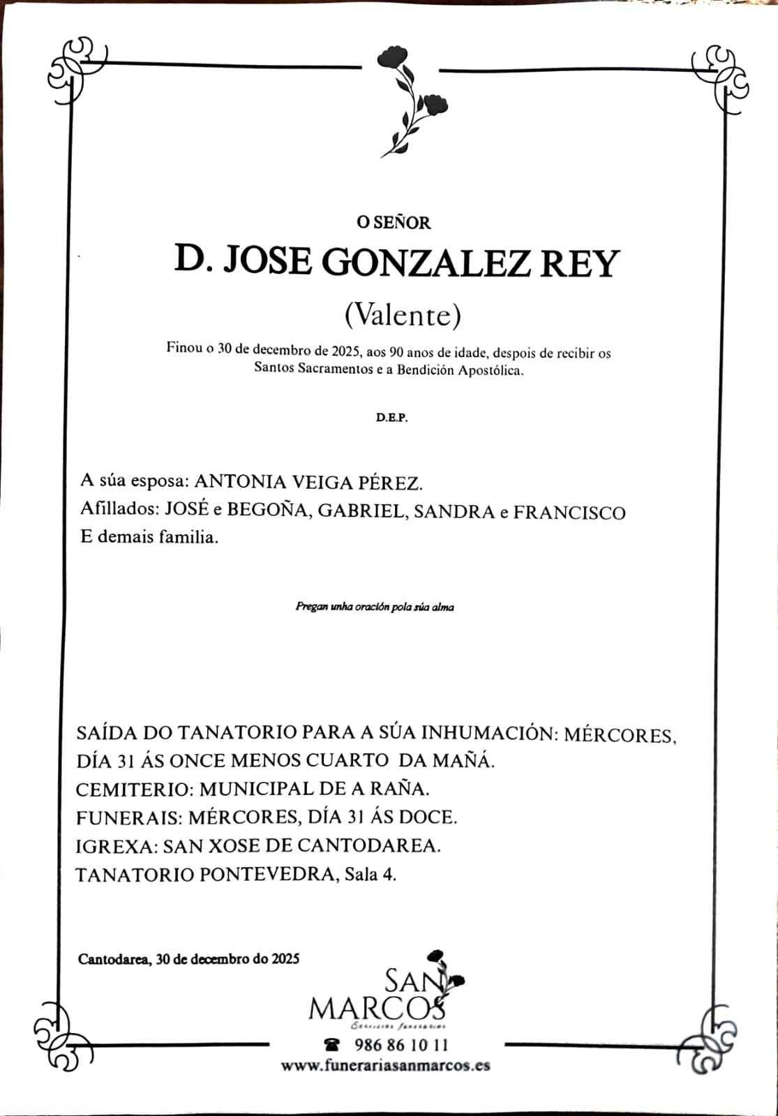 La funeraria SAN MARCOS comunica el fallecimiento ayer día 28 de diciembre, de Don JOSÉ GONZÁLEZ REY cuyos restos mortales permanecerán en el tanatorio San Marcos de PONTEVEDRA, sala número 4, hasta el momento de su traslado, MAÑANA MIÉRCOLES, día 31 a las ONCE MENOS CUARTO de la mañana para su inhumación en el cementerio municipal de A Raña en Marín.
