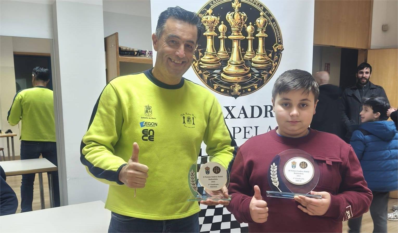Este fin de semana se celebró en Redondela un torneo de navidad de rápidas donde participaron 2 jugadores del club “Xadrez Marín”, Miguel Santiago, presidente del club y Xoel Prado, ajedrecista de la categoría sub-10.