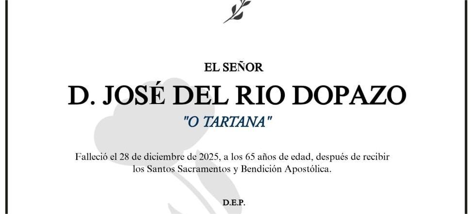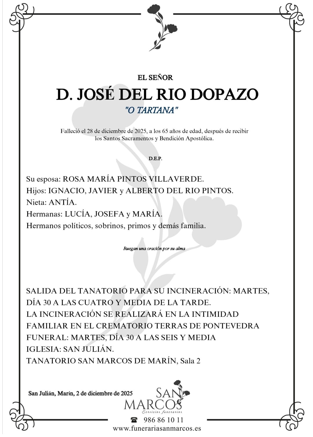 La funeraria SAN MARCOS comunica el fallecimiento ayer día 28 de diciembre, de Don JOSÉ DEL RÍO DOPAZO cuyos restos mortales permanecerán en el tanatorio San Marcos de Marín, sala número 2, hasta el momento de su traslado, MAÑANA MARTES, día 30 a las CUATRO Y MEDIA de la tarde para su incineración en el crematorio “Terras de Pontevedra” en la intimidad familiar.