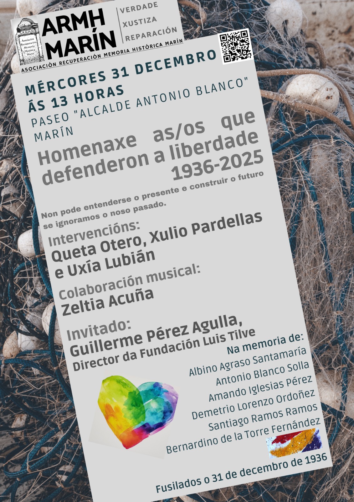 Ademais das palabras da presidenta da asociación, Queta Otero, falarán tamén Xulio Pardellas e Uxía Lubián, e a intervención central correrá a cargo de Guillerme Pérez Agulla, director da Fundación Luis Tilve, enmarcada na conmemoración do centenario do pasamento do histórico político e sindicalista Pablo Iglesias Posse. Algúns dos marinenses homenaxeados tamén formaban parte de agrupacións ou federacións sindicais; organizacións que sufriron de forma cruenta a represión e persecución franquista.