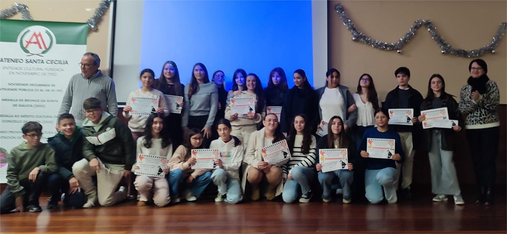O alumnado do instituto Illa de Tambo e do colexio Inmculada recolleros os distintos premios no acto outorgados por un xurado formado por Rai Calviño Iglesias, Alba Prado Fuentes e Pablo Santiago Martínez e reunido aos efectos de valorar os traballos presentados actuando como secretaria a vicepresidenta do Ateneo Isabel Martínez Epifanio.