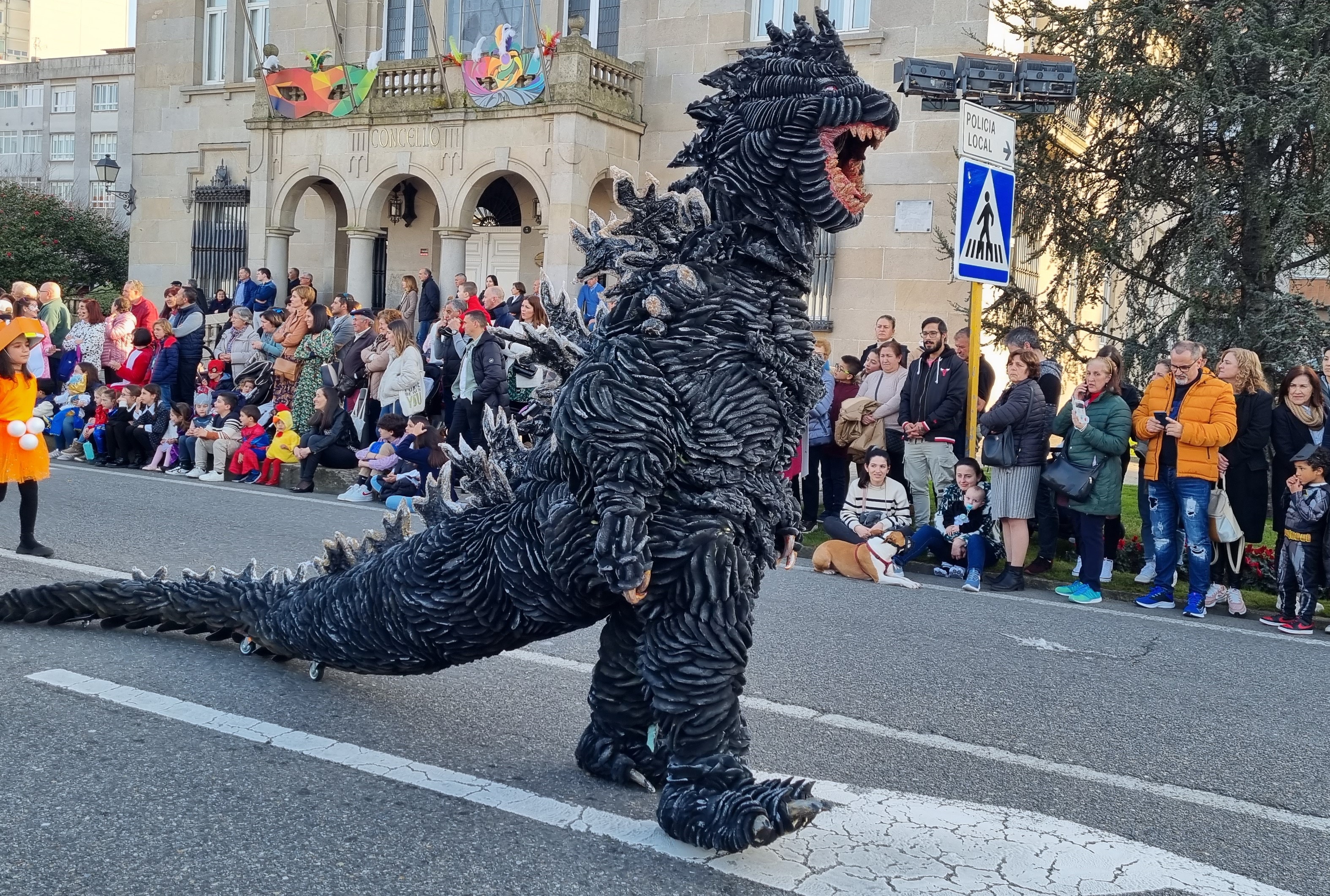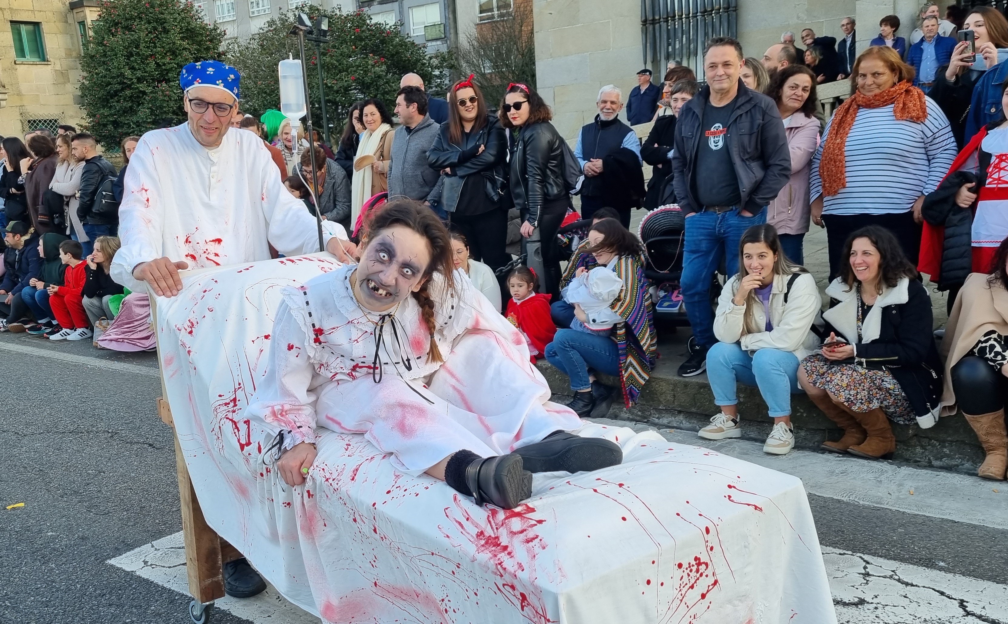 Desde su misma salida de Cantodarea, el desfile de carnaval celebrado esta tarde en Marín fue presenciado por miles de personas a ambos lados del itinerario que permanecieron las más de dos horas que duró el paso de las comparsas y los disfraces que este año, en lo que se refiere a individuales y parejas, han sido bastantes menos que en ocasiones anteriores