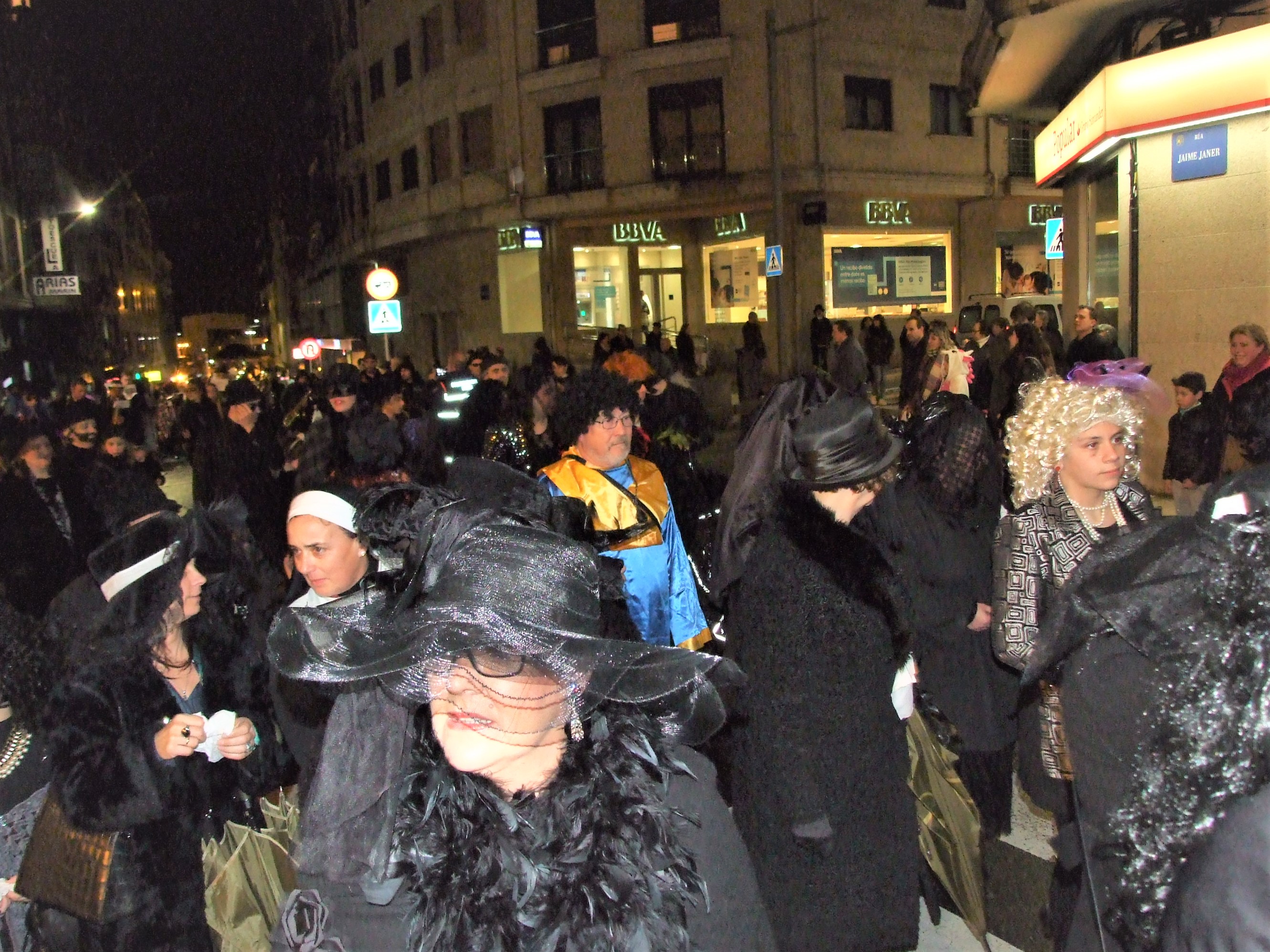SERÍAN por el año de 1996. Estaba la noche oscura. Era febrero, la luz del día ya se había precipitado al otro lado de la ría. Entraba humedad del mar, y las calles brillaban impregnadas de transparente pátina, iluminadas por los fanales que, poco a poco iban tomando intensidad hasta su plenitud. La gente se agolpaba a lo largo del itinerario por el que discurriría el cortejo. Comenzaron a surgir encapuchados de las instalaciones del Ateneo Santa Cecilia, portando estandartes de las distintas cofradías (la del pulpo, la sardina, etc.). Otros llevaban candiles encendidos. Detrás, grupos de viudas, rigurosamente enlutadas, portando coronas, caminaban mientras proferían lastimosos ayes, quejas y lamentos. Por fin, apareció el catafalco portado a hombros por cuatro encapuchados revestidos de túnicas blancas y negras. A un lado y al otro colgaban dos coronas de laurel. Cuatro farolillos, uno en cada esquina, decoraban el pequeño ataúd decorado con delfines, pulpos y sardinas de color azul. Sobre el naranja de las telas fúnebres que cubrían el catafalco, caía una cinta de color negra con letras doradas. Unos pasos más atrás, bajo palio, aparece un grotesco obispo barrigudo y narigudo, acompañado de un cura y un monaguillo, portando uno una bacinilla y una escobilla del váter; el otro, un cuadro de una parrilla invertida. Cada cual con sus correspondientes pelucas: una blanca, la otra pelirroja, con dos antenas, una a cada lado (dos pajitas para absorber refrescos); impartiendo bendiciones a diestro y siniestro con la mano izquierda, en la que lleva un enorme anillo con luz. Su correspondiente báculo y medallón con cadena. Detrás, aparecen estrafalarias autoridades civiles, militares y religiosas. Un grupo esperpéntico y desenfadado; pero ataviados con todo lujo de detalles ocurrentes y extravagantes. La música acompaña al cortejo y al concurrido número de viudas, viudos, solteras, solteronas y algún que otro personaje despistado, incluido en el desfile. Llegaron a una esplanada, en donde las autoridades fueron ocupando sus puestos en un palco allí instalado para la ocasión. Durante todo el trayecto se oía por la megafonía las oportunas explicaciones dadas por el maestro de ceremonias desde el propio palco. Se respiraba, además, un insoportable humo, provocado por el fuego de cuerdas, brea y cuantos elementos inflamables e insoportables se quemaban en unos bidones metálicos dispuestos para la ocasión. Una vez en el palco, el mismo cura antenado con las pajitas y provisto del cuadro con la parrilla invertida; soltó un discurso jocoso, ceremonioso, ocurrente y con su pizca sátira y picante. Una vez concluido, el obispo revestido de manera ostentosa, con su punto de elegancia, estrafalaria y esperpéntica leyó la centenaria LADAÍÑA DA SARDIÑA. Obra escrita por uno de los personajes de la villa para despedir el Entierro de la Sardina que, en boca del obispo sermonaba, regalando con su voz a los presentes y oyentes en la alameda: las esencias marinas de la villa; el barroquismo galaico convertido en jacarandosos rezos burlones y populares. Un escenario impresionante, desconcertante, original ,sentido y compartido por un pueblo que participa activamente. Pocas veces se contemplan escenas de esta índole, en las que se implican todos los sentidos (aquel tufo, con aquel humo que despedía cuanto ardía en el caldero, se metía por nariz y garganta, provocando la inevitable tos). La música, los colores, la puesta en escena de los distintos personajes, las quejas insufribles de las desconsoladas viudas. O, la improvisación y ocurrencias de quienes se cuelan de rondón en el cortejo. Una vez acabado el sermón, se entierra ( se tira) la sardina al mar de donde procede y vuelve. Y, como por arte de encantamiento, la tristeza, la música fúnebre, las lamentaciones se transforma en desenfreno, algarabía e irreprimible alegría festiva: el muerto al hoyo, y el vivo al bollo.
