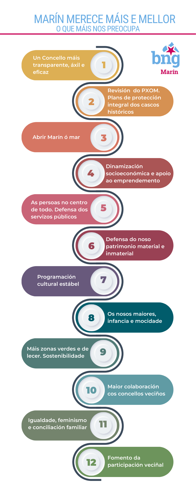 Como sabedes o BNG de Marín presenta unha lista integrada por unha ampla equipa de persoas íntegras, leais e honestas, capaz de darlle un cambio de rumbo ao Concello e poñer en marcha políticas transformadoras para mellorar a vida das persoas do noso Marín que tanto queremos. Levamos moitos meses traballando de forma activa neste proxecto con reunións e aportacións de moitas e moitos marinenses, con equipas de goberno doutros concellos para recoller as súas experiencias e dos grupos internos de traballo semanal do programa electoral.