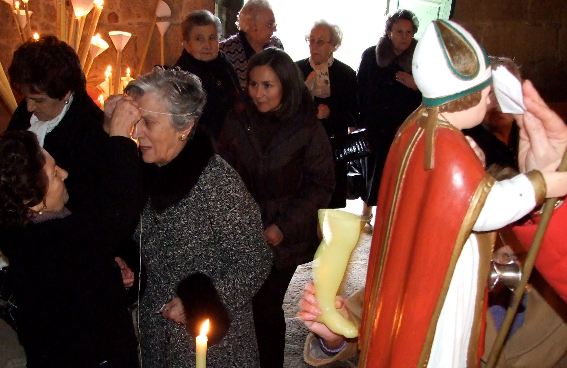 Otro de los ritos es el de las mediciones con cordones encerados que las expertas en su práctica emplean par hacer una simbólica medición del cuerpo del devoto, y sobre todo de su garganta, como efecto protector contra los males que puedan surgirle a la misma durante el año.